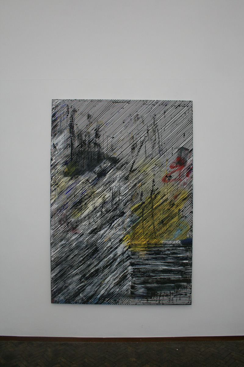 The title of the show is Platinum Metre after an interview with Paolo Virno: The dismeasurement of art. In this interview he argues that every time art comes up with a new form, the old ways to measure this form don’t function anymore: “It is as if the platinum metre bar kept in Paris to define the standard length of a metre suddenly measured 90 or 110 centimetres.” Herein he sees a linkage between the artistic avant-garde and the radical social movement: “They both would like to explain that the old standards are no longer valid and to look for what might be new standards”. “Avant-garde art proved the impotence, the inadequacy, the disproportion of the old standards through a formal investigation. The common ground of art and social movements is never about content”. So for Virno the most revolutionary point in contemporary art is to be found in the formal side; for him this leads to ”new ways of living and feeling.” I like this direct link in his thinking between living and feeling and the formal . Nowadays it seems that if you want your work to be seen as engaged with the world you have to use either a lot of black paint or be very clear and illustrative.I first asked Wendy White whose work I like because of the empty unpainted canvas space in it and the intuitive and human approach to the whole idea of painting. That immediately brings me to Michiel Ceulers who also recently described paint as a humane material to work with and I asked my friend Bas van den Hurk whose work looks really improvised and nonchalant but is totally imbedded in a programmatic research of the autonomy of painting. All of them working consciously with ‘flaws’ and ‘ faults’ . In that way the ‘faults’ and ‘drips’ in the works of Roland de Bloeme and Tatjana Doll are not that far away although each of these artists work within a totally different idiom. Ronald mixing pop and hard edge and Tatjana using idols from art history and objects like cars and fire extinguishers. With their works I have a long relationship through our mutual friend Joep van Liefland and his art space Autocenter in Berlin. Ronald suggested to invite Olaf Holzapfel and through my friend Peter Fengler who runs artspace De Player in Rotterdam I came in contact with the work of Alivia Zivich and Nate Young.
