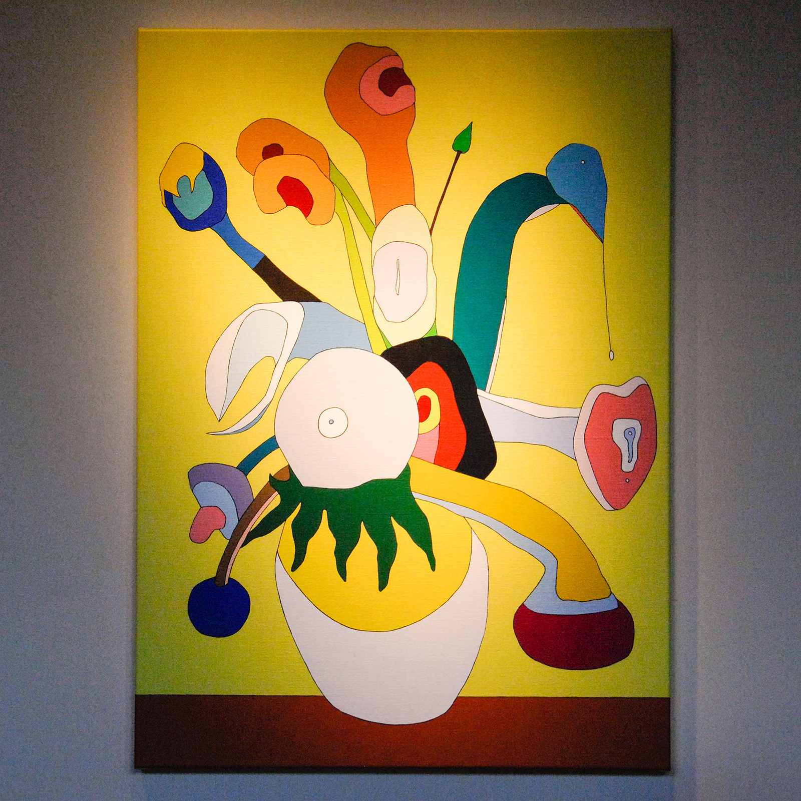 Eerlijk is eerlijk, het is dat Hester Alberdingk-Thijm de curator is. In het dagelijks leven is zij de directeur van de kunstcollectie van Akzo Nobel die onder haar bewind een sterke collectie heeft opgebouwd. Ze heeft de taak op zich genomen om dus een tentoonstelling in een restaurant te organiseren en dan ben ik toch wel benieuwd hoe ze die bovenstaande vragen oplost. Haar oplossing zit hem ten dele in een overkoepelend thema ‘pudding’. Zowel luchtig als zoet en een tikkeltje absurdistisch in zijn banaliteit. Dankzij die insteek, die natuurlijk perfect aansluit bij een eetgelegenheid, kan ze zowel op vorm als op inhoud werk selecteren. Dat is gedaan met zowel enkele bekenden als ook wat jonger talent. Sommige werken zijn mierzoet (zowel qua kleur als smaak), anderen hebben een scherper randje zoals het werk van Danielle Hoogendoorn en Jeroen Kusters (hun werk lijkt me minder smakelijk op je bord). Het zijn overwegend kunstwerken die sterk hun eigen ruimte opeisen. Dat Rothko zijn werken niet in een restaurant wilde is duidelijk, maar vrijwel alle kunstwerken hier kunnen het prima hebben. En andersom even zo goed. Het resultaat is een galerie in een restaurant, of een restaurant in een galerie. Want ja, de meeste werken zijn ook gewoon te koop.