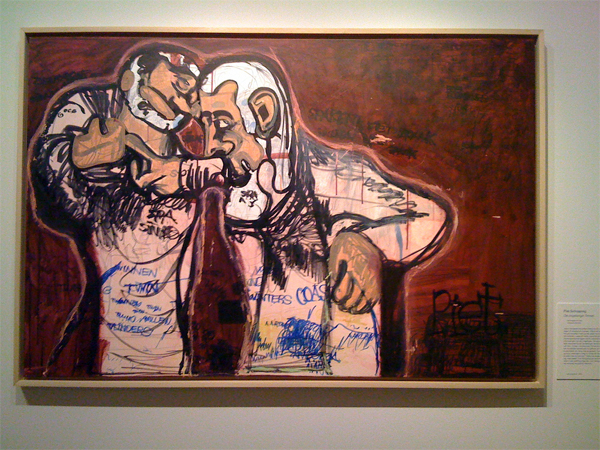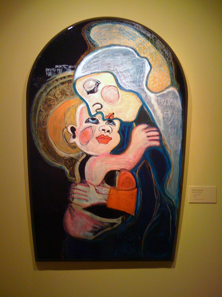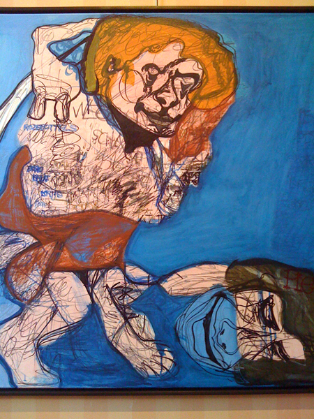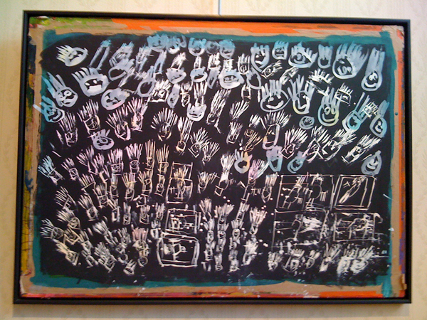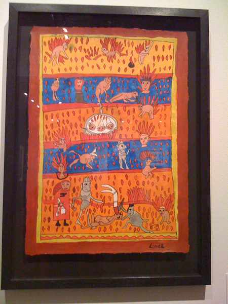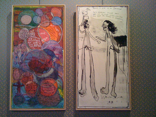 [Vaste lezer Vera (@veermus) zond ons onderstaande post en foto’s toe. Aanvankelijk had ik niet echt in de gaten wat voor kunstenaars het waren. Later bleek dat het kunstenaars met een verstandelijke handicap zijn.Wat mij direct op viel echter was dat het zeer serieuze onderwerpen zijn, die op heel erg positieve en toegankelijke manier in beeld gevangen zijn. Dat is best een prestatie en onverwacht natuurlijk. De hel ziet er uit als een vrolijke plek terwijl dat niet zo bedoelt is natuurlijk. De kunstenaars hier zullen in de elitaire kunstkringen niet echt serieus genomen worden. Dat is begrijpelijk. Deze mensen gaan, en kunnen, niet zo bewust om met wat dat beeld precies is. De vraag die ik daar even tegenover wil stellen is of dat echt erg is? Dit soort werk lijkt toch vaak dichter bij de kunstenaar zelf te liggen dan dat van veel echte bekende kunstenaars.