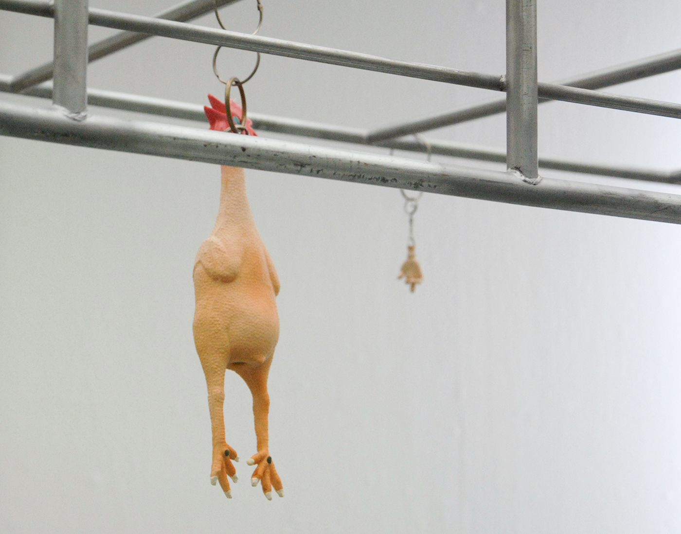 Cady Noland – Chicken Awning frame – Gegalvaniseerd en verschroomd ijzer, beton, plastic, elastiek, vilt en rubber (detail)