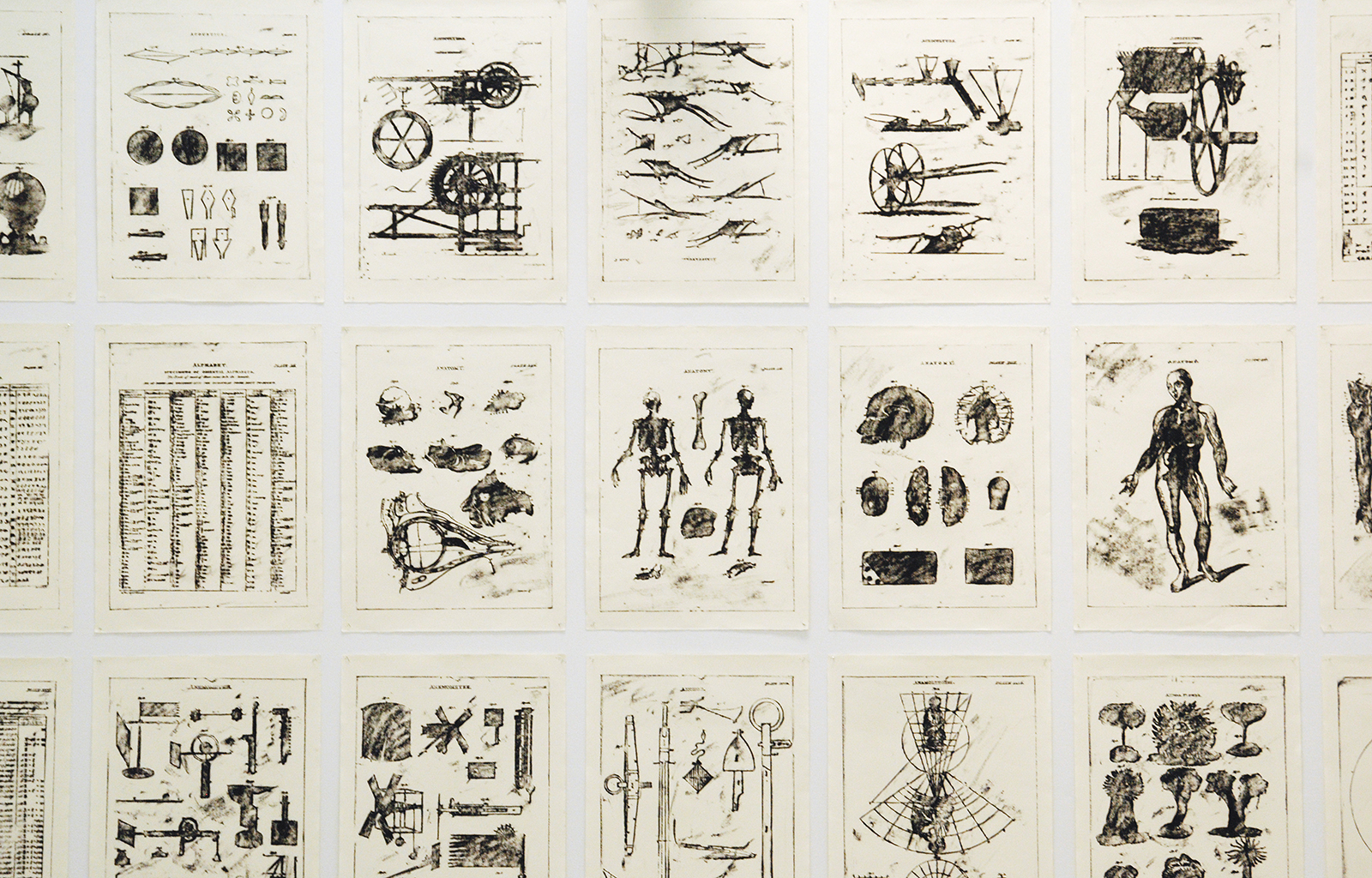Matt Mullican – Untitled (New Edinburgh Encyclopedia Project) – 449 Oliestift tekeningen op papier in 16 dozen in houten kabinet (detail)
