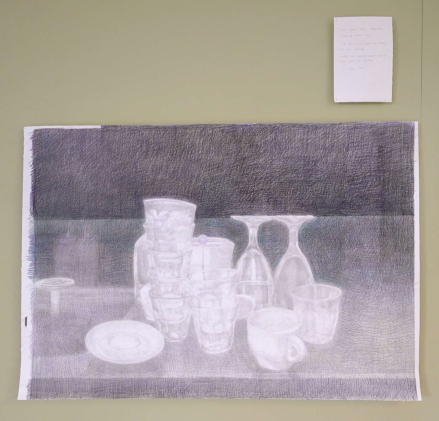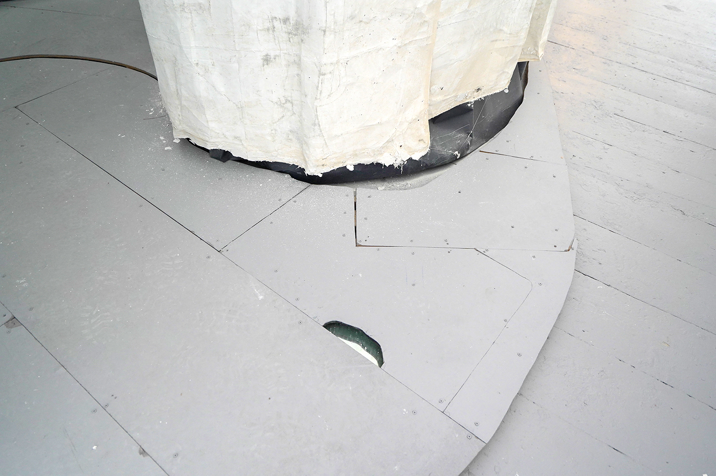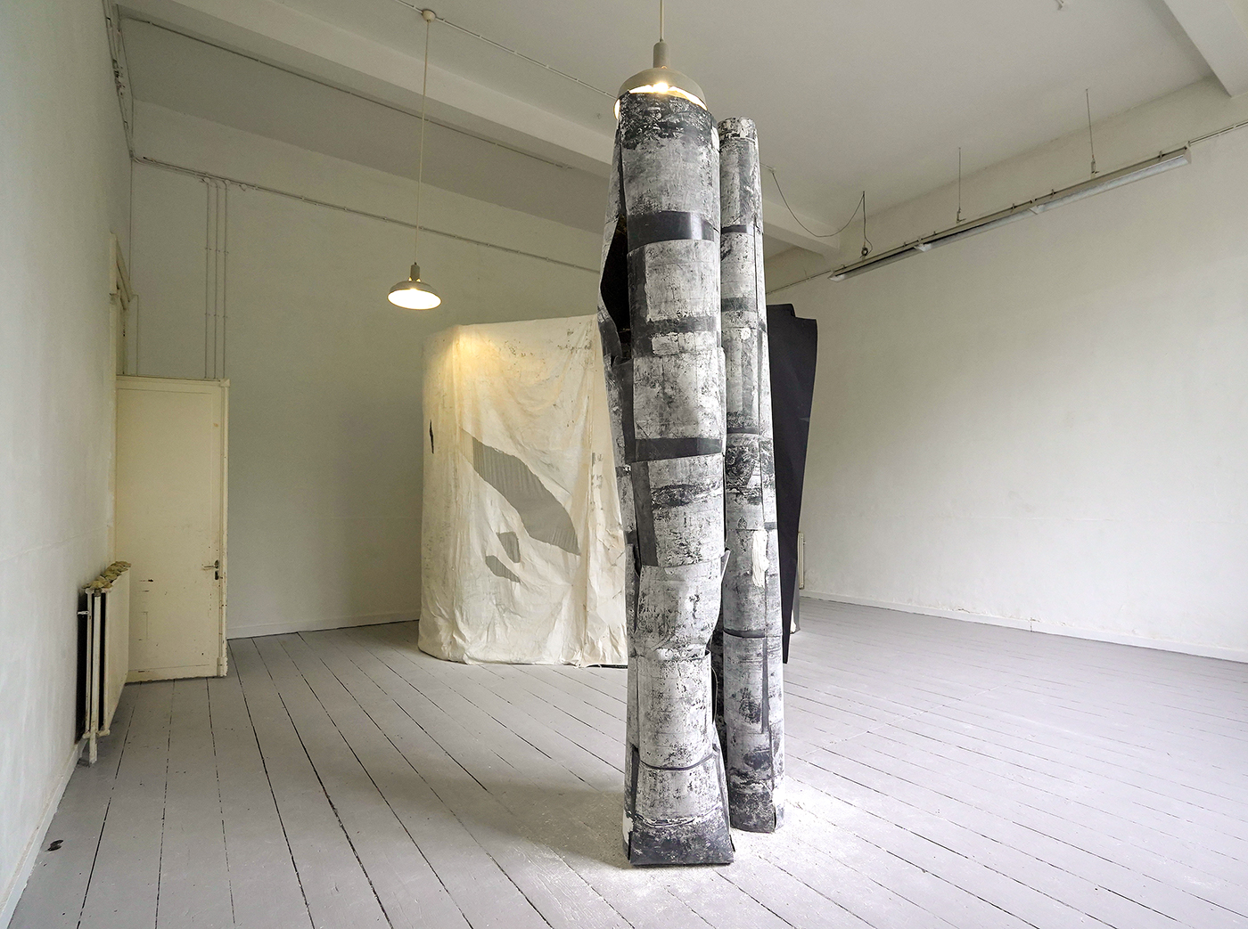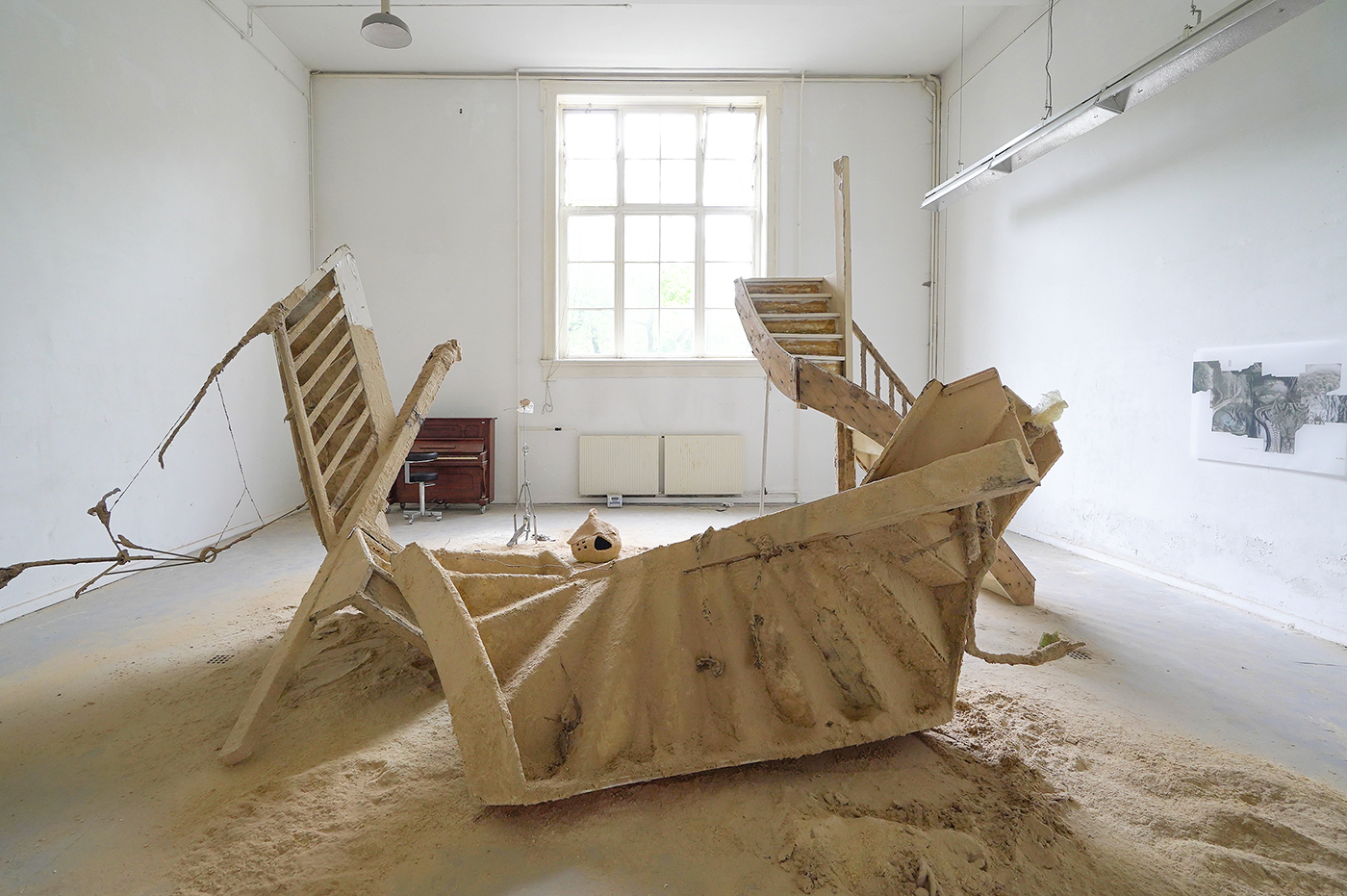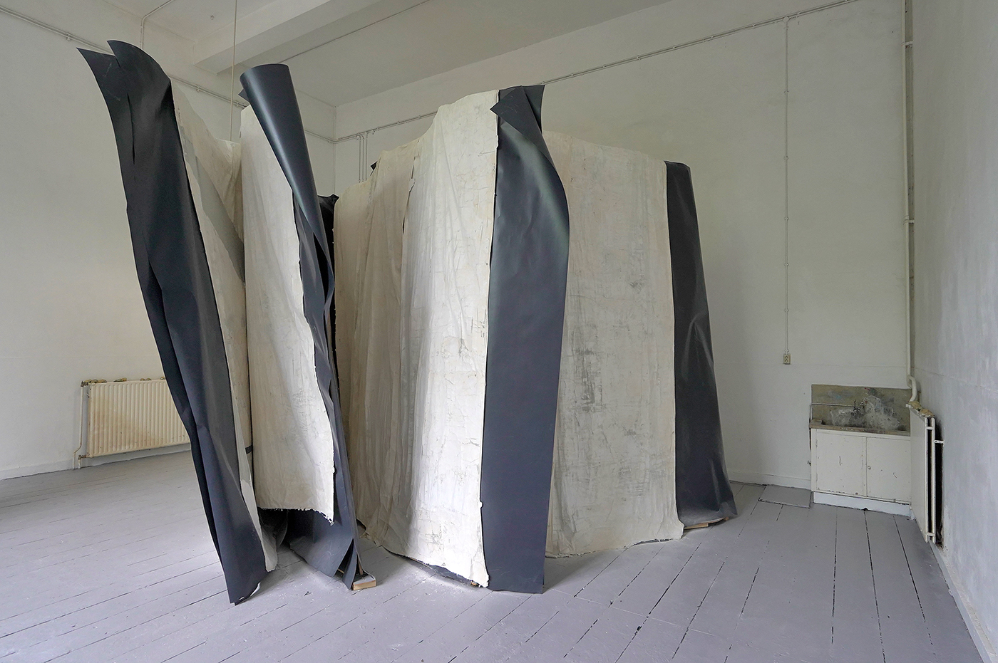 De tendens van grote immersieve installaties is de laatste paar jaar op eindexamenexposities merkbaar. Jonge kunstenaars lijken zich ofwel richting klassieke media te bewegen of naar totaalervaringen. Vaak zijn dat installaties die bestaan uit een grote hoeveelheid objecten die samen betekenisvol worden. Bij de tentoonstelling hier op De Ateliers zie je dat het juist veel monumentaler is. Een heldere uitspraak waarin een hoop nuance besloten ligt. Denk hierbij aan het spiegeltje in de nieuwe vloer bij het werk van Klaartje van Essen. Een kleine maar zeer bewuste ingreep in een metershoog werk.