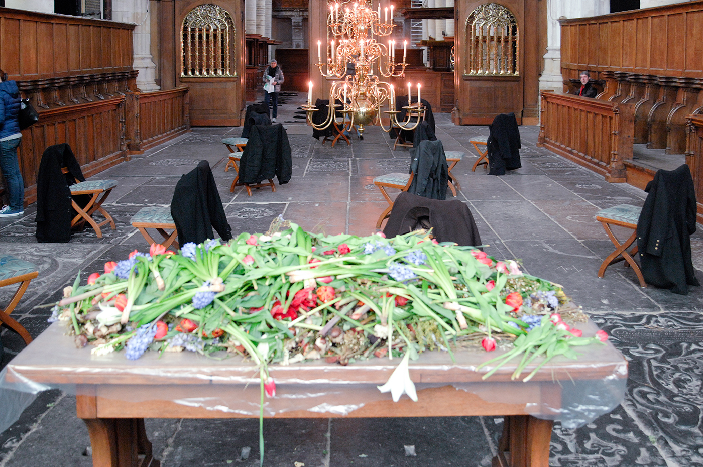 Als apotheose is het altaar bedenkt met verwelkte bloemen. Als een soort theatrale geste naar het verloop van tijd en haar conservering.