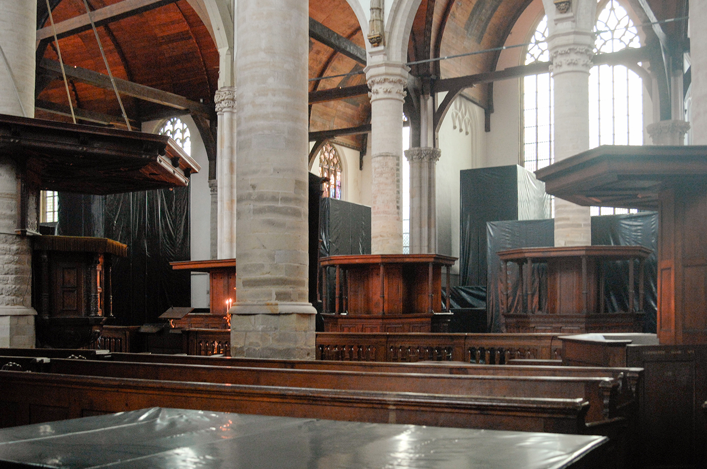 Maar dan de tentoonstelling zelf. Het is hier al vaker vermeld, het is geen eenvoudige locatie om naar je hand te zetten. De kerk is groots en theatraal. Dat blijkt voor Boltanski geen enkel probleem, hij vult de ruimte met een nog meer theatrale ingreep. Wie binnentreed stuit direct op enorme zwarte monolieten. De kerk is veranderd in een labyrinth van zuilen. Tussen die zwarte blokken staan jassen opgesteld die zodra je dichter bij komt fluisterend vragen of je “geleden hebt”.