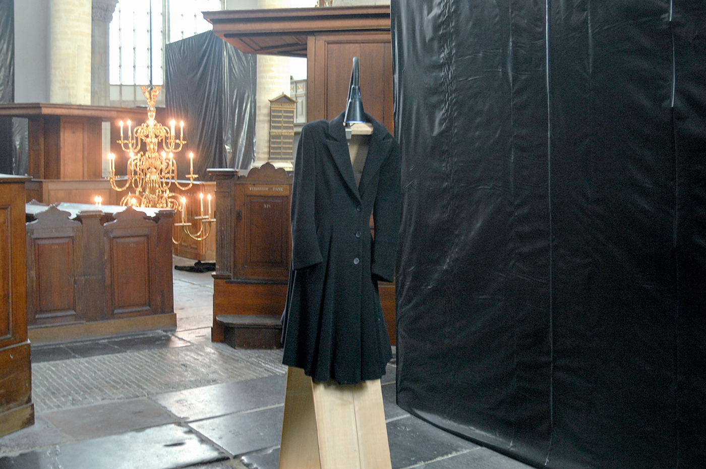 In de middenruimte hangen de kroonluchters laag en wederom een hoop jassen. Jassen op de vloer, jassen op stoelen en een jas aan de muur. Het geheel krijgt diverse connotaties en bij Boltanski doet het dan ook direct denken aan beelden van de Holocaust.