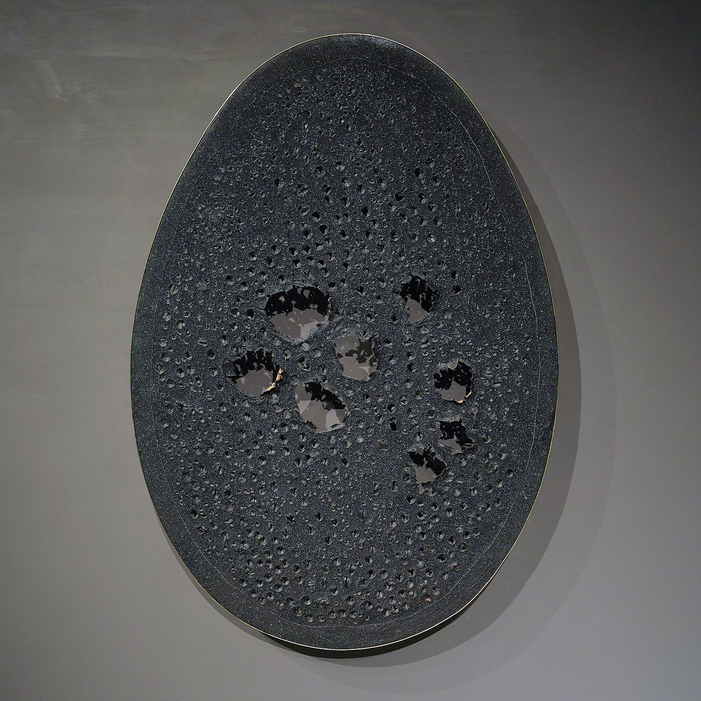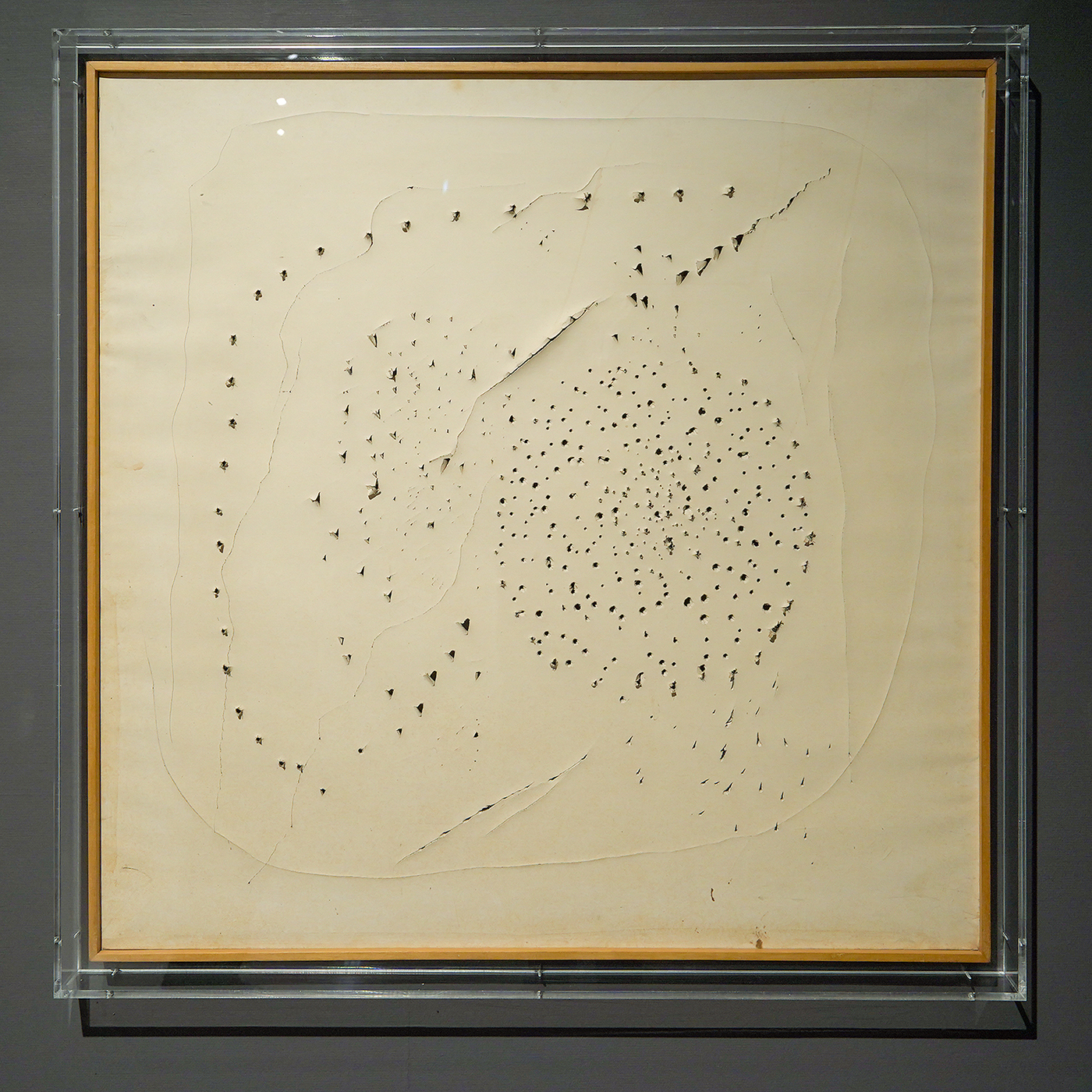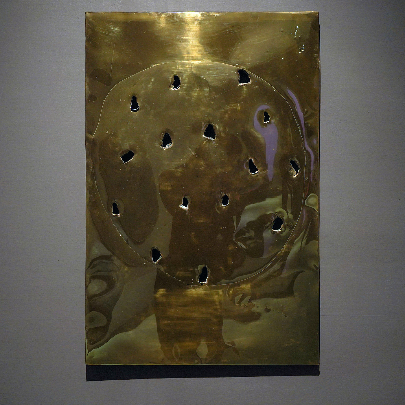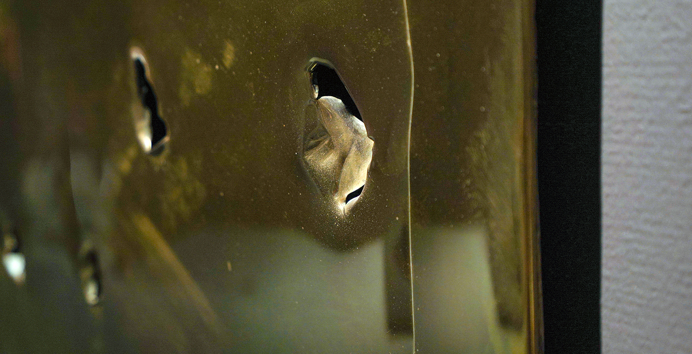 De gaten zijn er niet als een agresieve daad, maar om het materiaal te benadrukken. Je kunt er niet doorheen kijken zoals door een raam, je kijkt door de gaten heen om zodoende juist te zien waar je daadwerkelijk naar kijkt. Een ruimtelijk object.