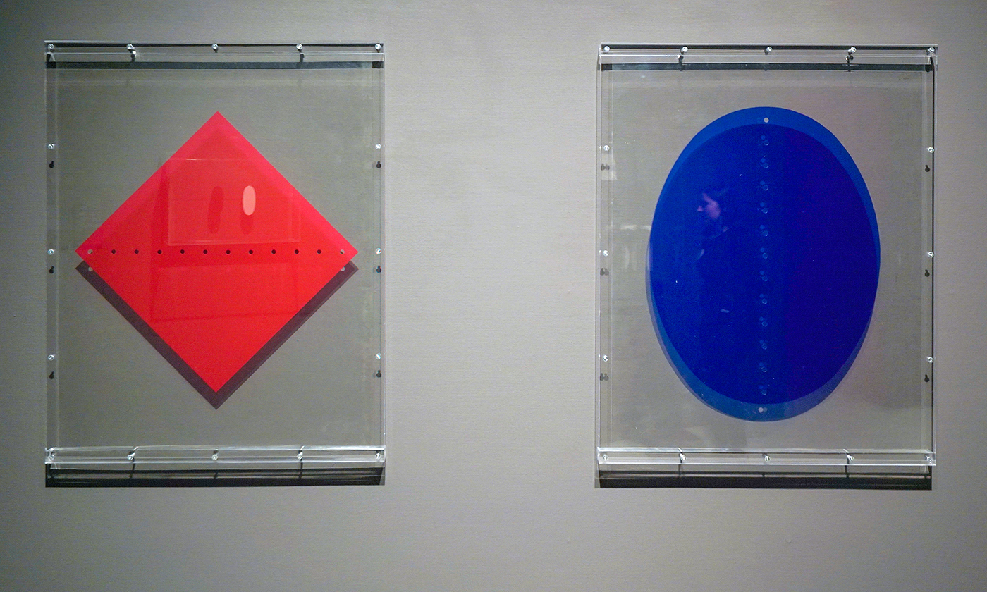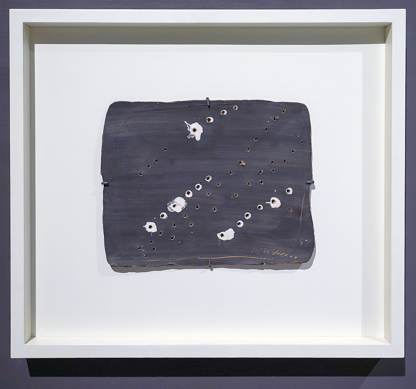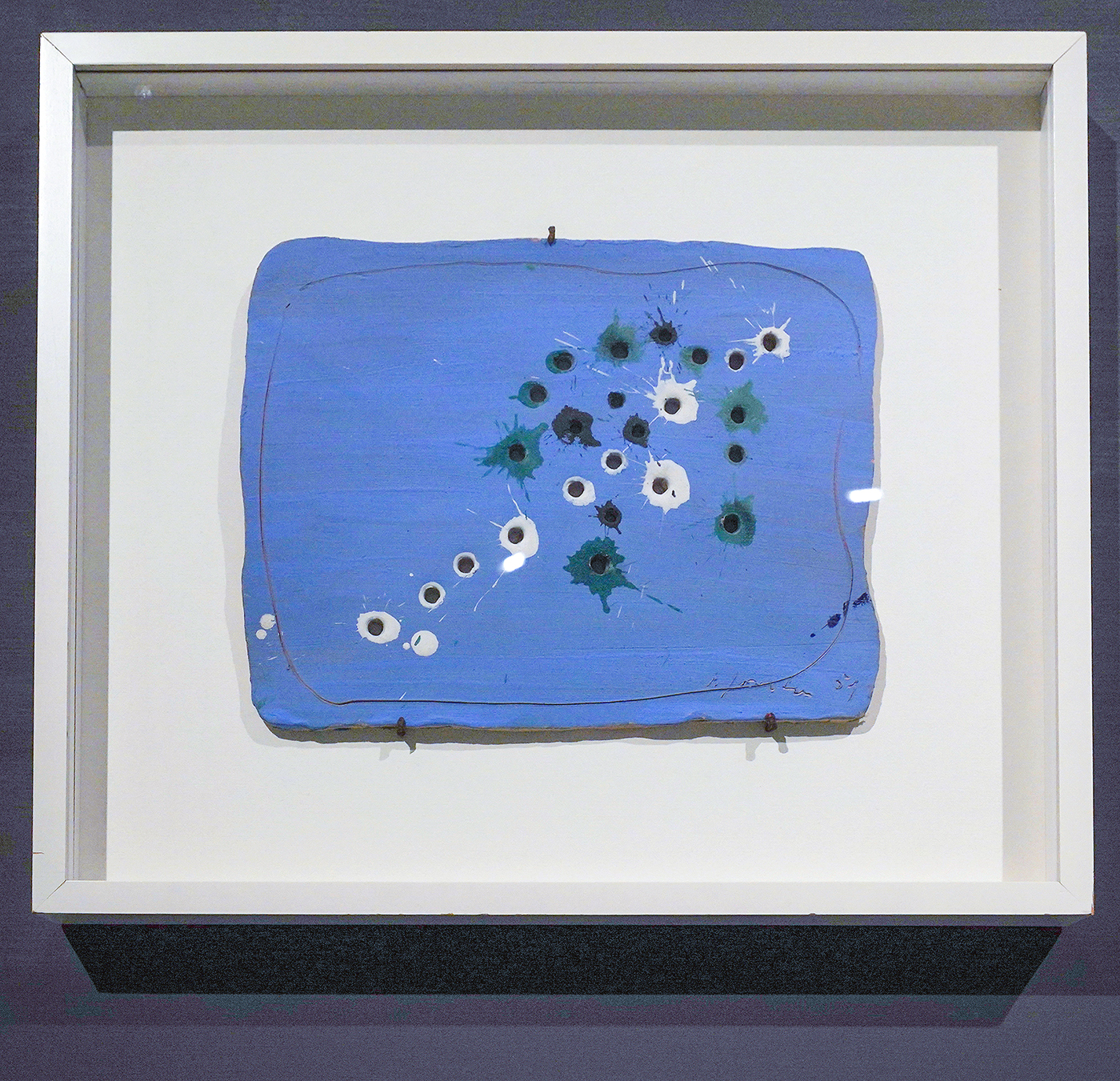 De gaten zijn er niet als een agresieve daad, maar om het materiaal te benadrukken. Je kunt er niet doorheen kijken zoals door een raam, je kijkt door de gaten heen om zodoende juist te zien waar je daadwerkelijk naar kijkt. Een ruimtelijk object.
