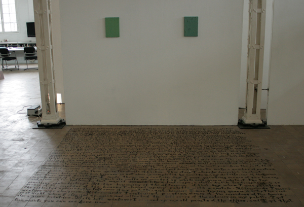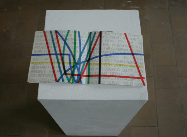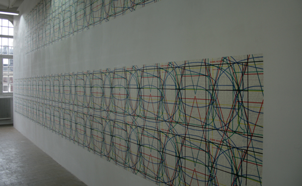 Meestal levert tekstueel werk nogal saai beeld op. Thomas I’Anson bewijst dat dat absoluut niet het geval hoeft te zijn. Niet alleen is het inhoudelijk interessant, beeldend is het ontzettend indrukwekkend. Niet alleen door het formaat maar vooral door de manier van vormgeven. Het levert een enorm krachtig beeld op wat ook als ik niet zou kunnen lezen erg weet te boeien. Kijk, dat zie ik graag.