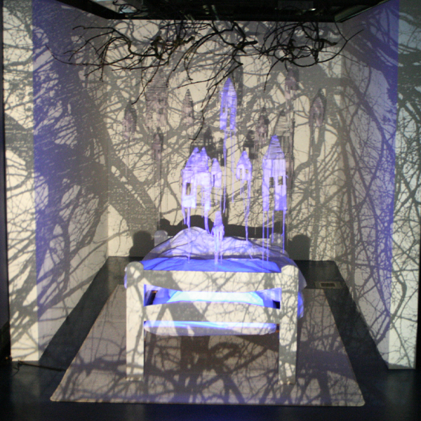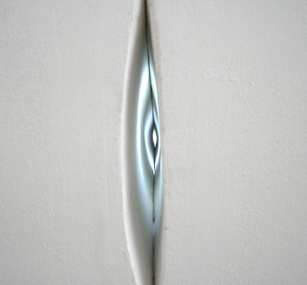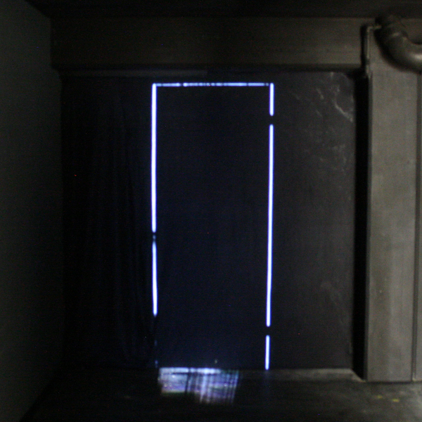 Bovenstaande gat in de muur van Elejan van der Velde is nog wel te fotograferen. In de kelder is een werk te zien van Van der Velde wat niet echt makkelijk te fotograferen was, een geprojecteerde deur. Heel subtiel wordt er gebruik gemaakt van een dunne lichtstraal. Door gebruik van geluid en soms verduistering van bepaalde stukken ontstaat er een heel levendig beeld.