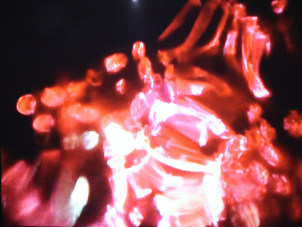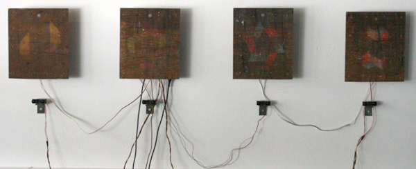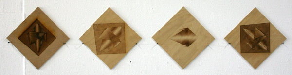 Bjorn Vogeling toont twee topwerken (1 is helaas niet fotografeerbaar). Hier zien we vier paneeltjes waarop grafisch gevormde ruimtelijke figuren worden getoond die bewegen. Daarbij is er geluid te horen. Een vreemd werk wat erg goed is uitgevoerd. Alleen die kabels zouden beter in de muur worden weggewerkt de volgende keer?