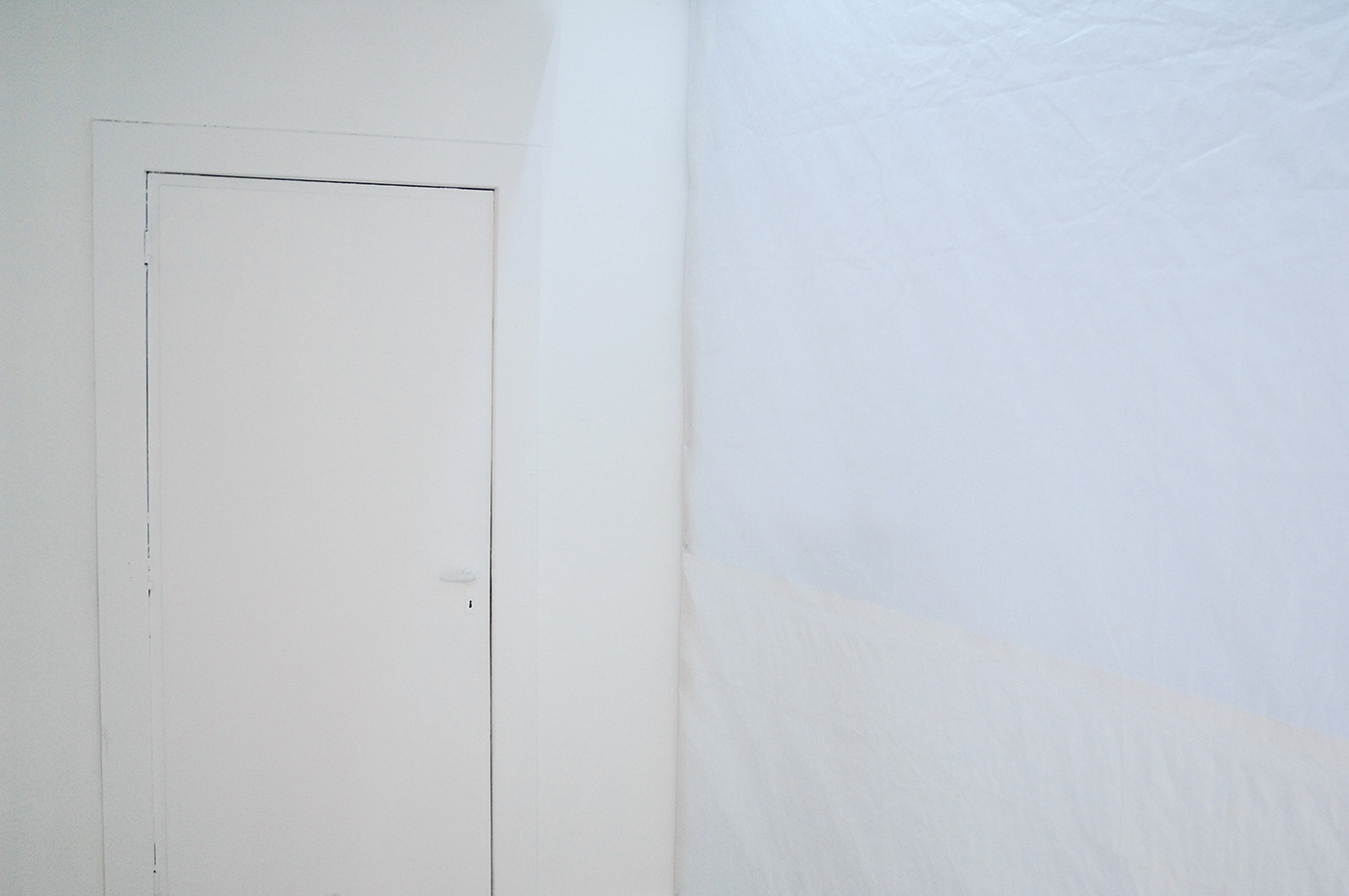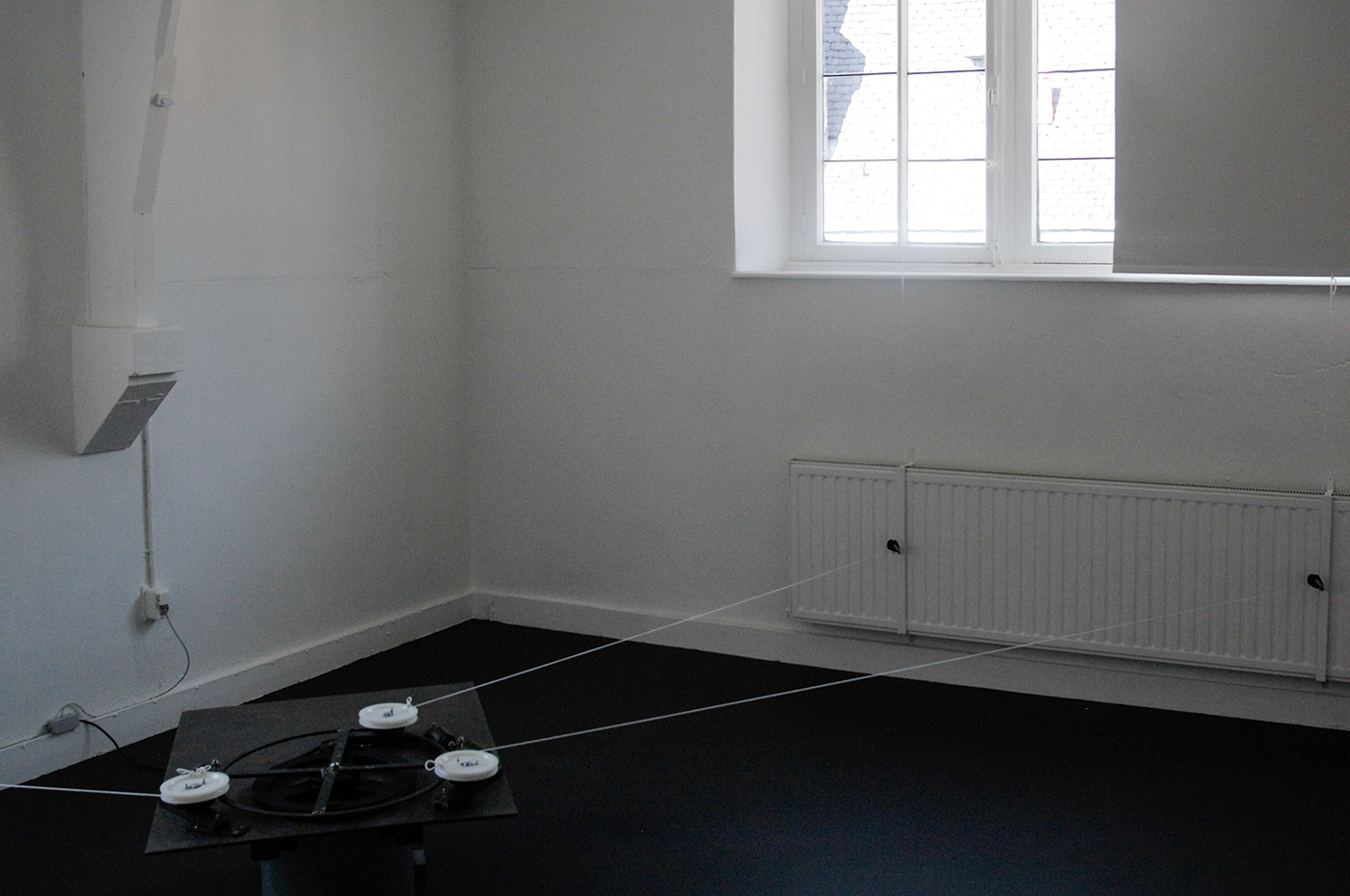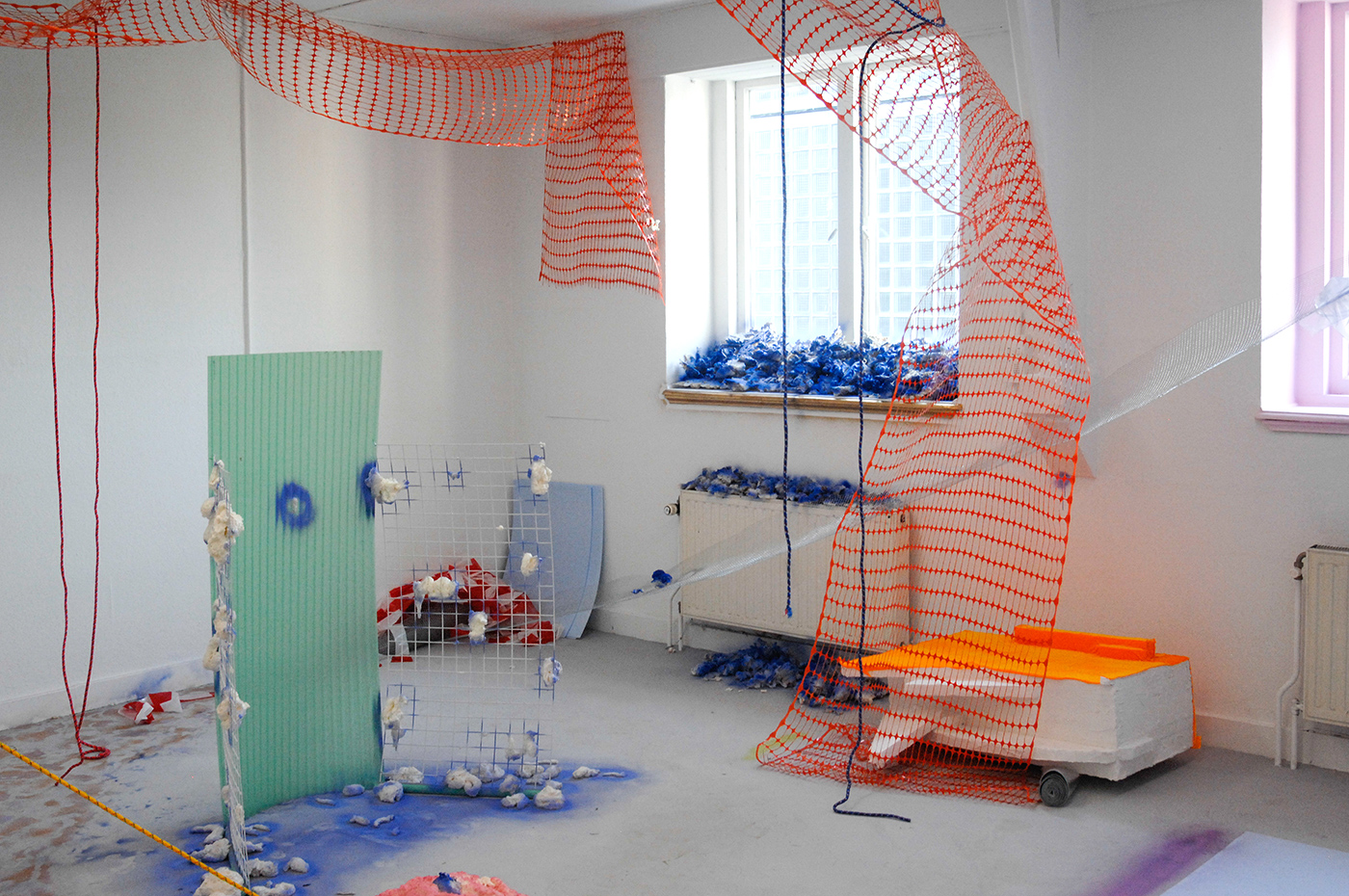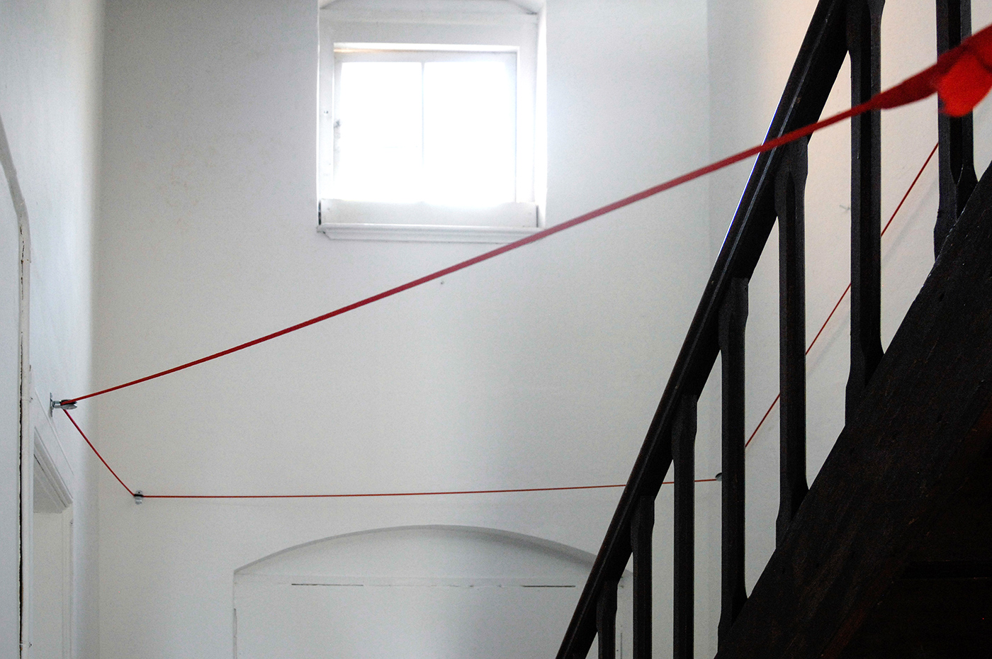 Zo begint het met het werk van Aurélie D’Incau, je trekt de ingang van een trappenhal open en ziet een rode band gespannen door de hal heen trekken. Eenmaal twee verdiepingen verder zie je dat het een sjorband is die langzaam aan door het deurmechaniek wordt aangespannen en zo een bouwwerk uit elkaar trekt.
