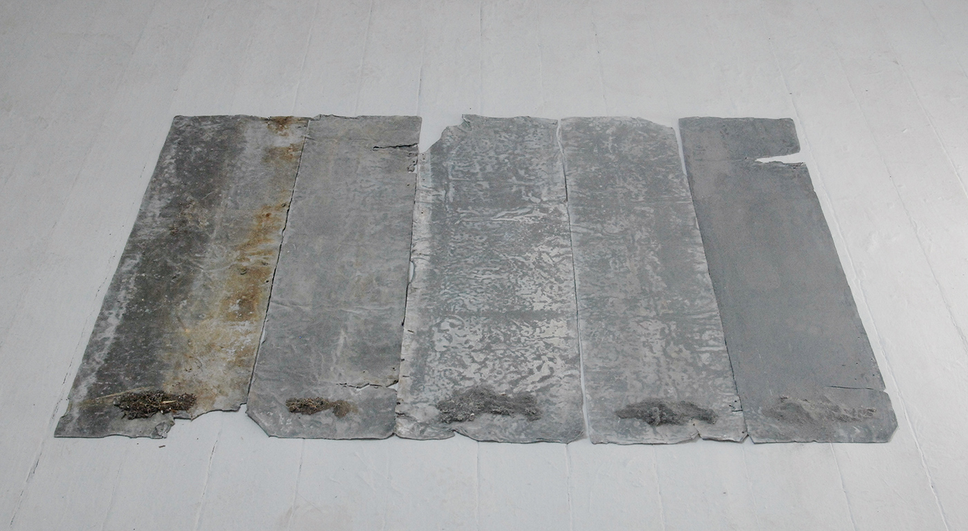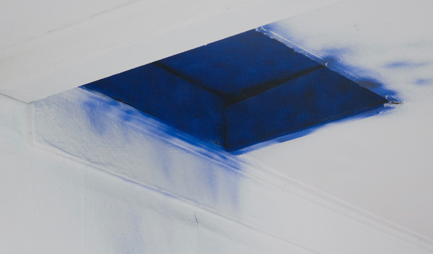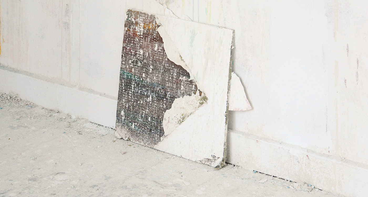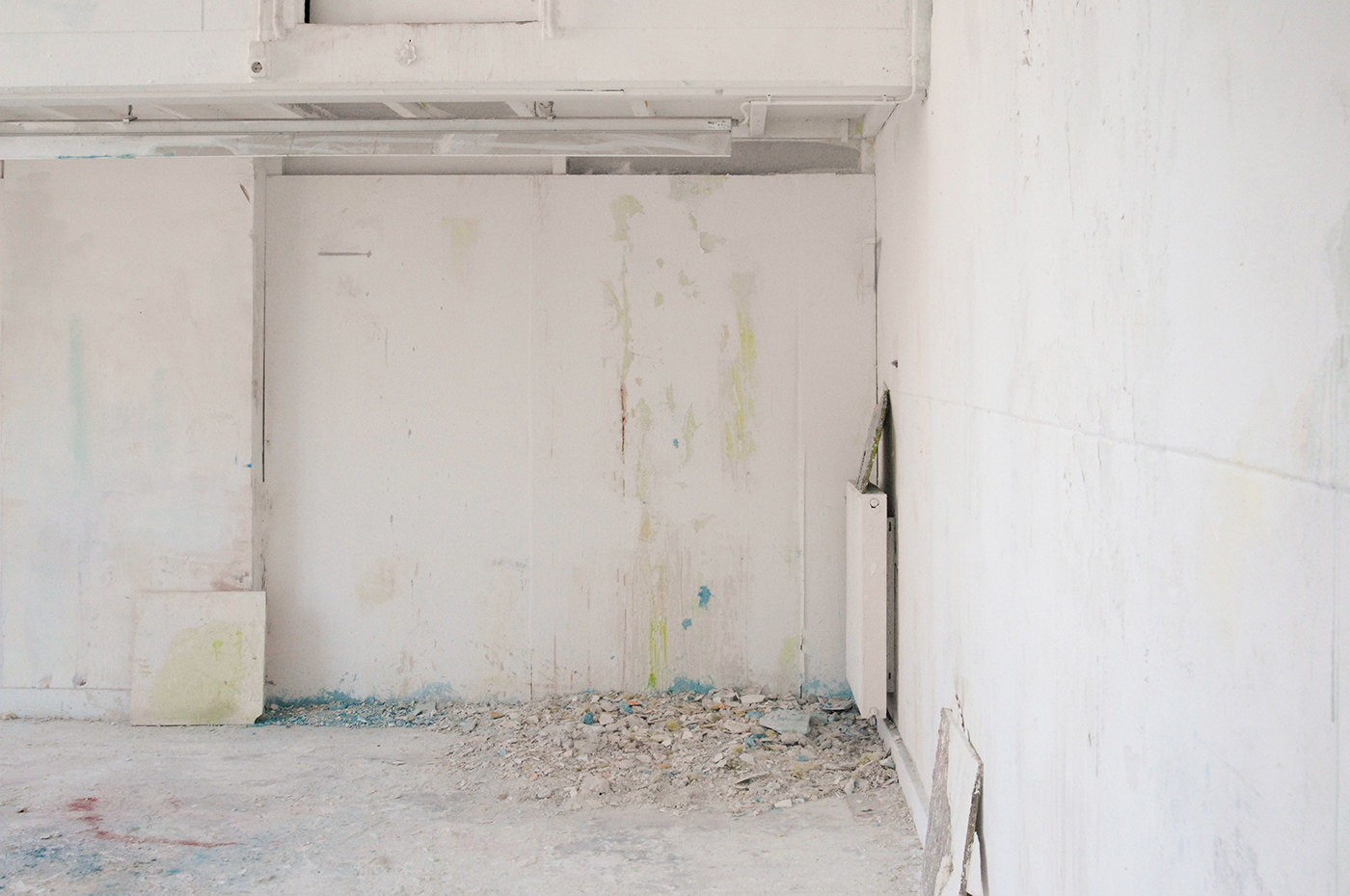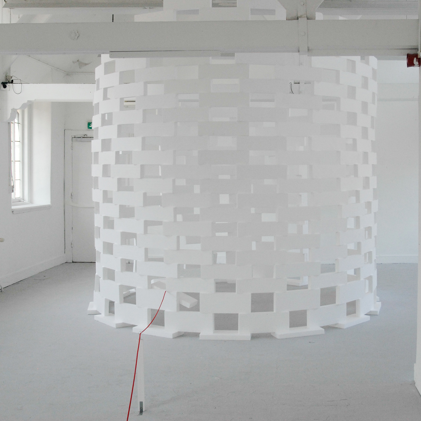 Zo begint het met het werk van Aurélie D’Incau, je trekt de ingang van een trappenhal open en ziet een rode band gespannen door de hal heen trekken. Eenmaal twee verdiepingen verder zie je dat het een sjorband is die langzaam aan door het deurmechaniek wordt aangespannen en zo een bouwwerk uit elkaar trekt.