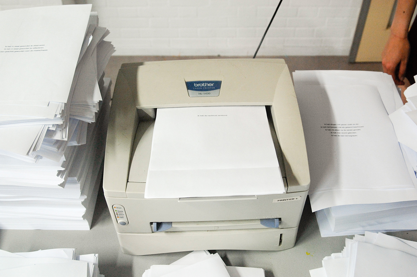De installatie van Marloes Meiborg is poëtisch, zowel letterlijk als figuurlijk. De kraan van de wasbak blijft druppelen. Tegelijk staat elders in de ruimte een printer aan de lopende band zelfbeschuldigingen uit te printen.