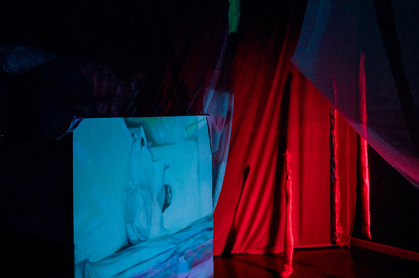Een knettergekke en verstikkende multimedia installatie van Tori Pounds, niet te fotograferen.