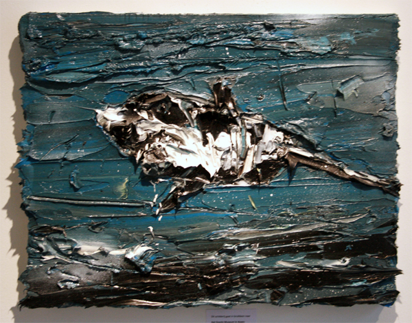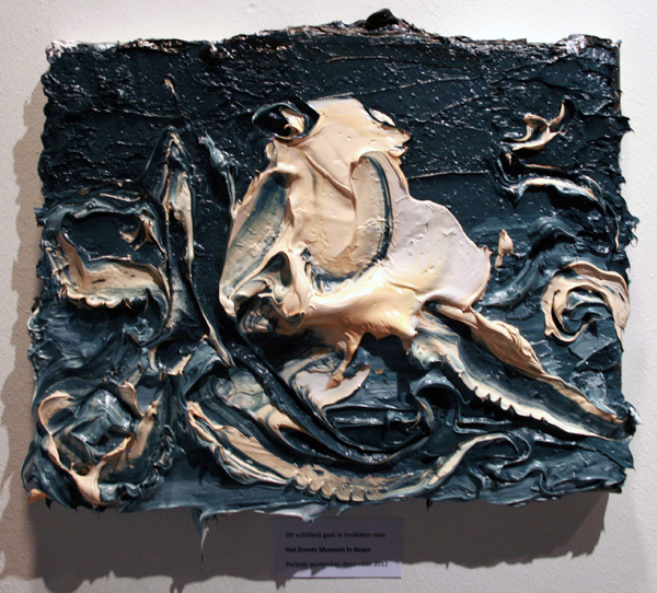 Met name de kleinere beelden waar hij duidelijk heel geconcentreerd aan heeft gewerkt laten veel spel met materie en voorstelling zien. De grotere werken missen (dankzij de wetten van de zwaartekracht) in verhouding de enorme massa’s verf. Dit zijn meer afbeeldingen van die vooral erg krachtig geschilderd zijn, maar dus eigenlijk juist die Lascauxe-kwaliteiten missen. Qua beeld doen de werken niet onder, maar gelaagdheid in het schilderen wel. De kleinere werken zijn gewoon vele malen spannender door juist die gigantische klodders verf, waarvan ik denk dat iedere bezoeker het zeer verleidelijk zal vinden, om er even met de vingers aan te zitten.