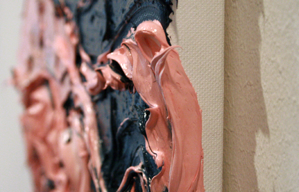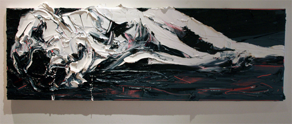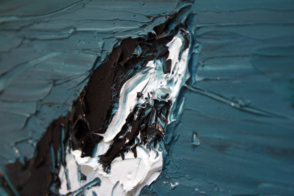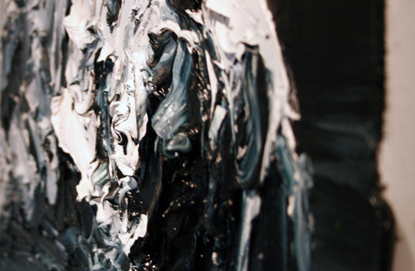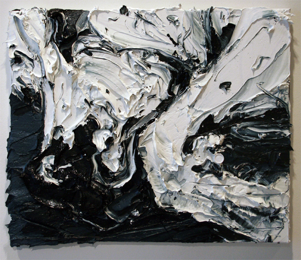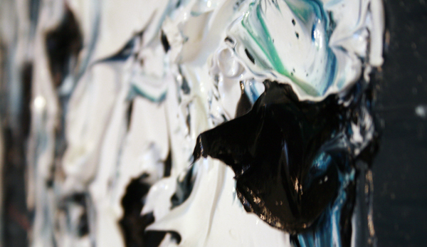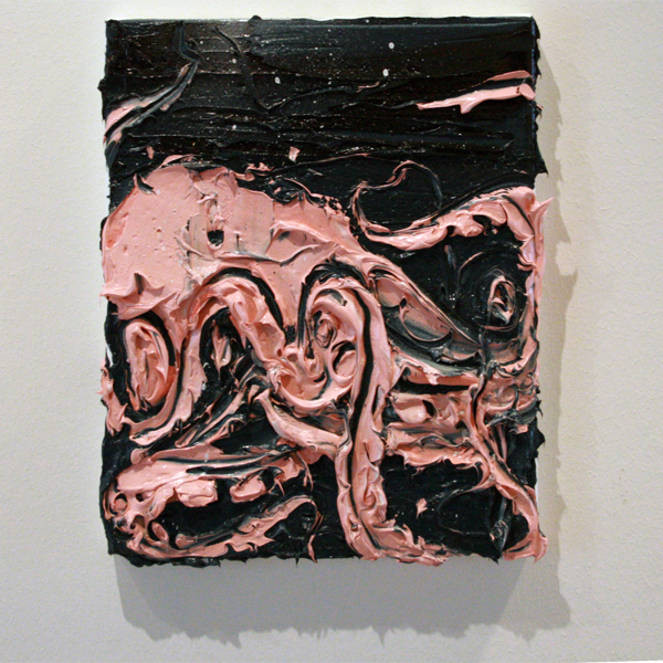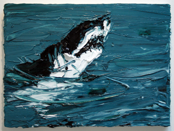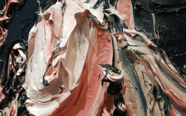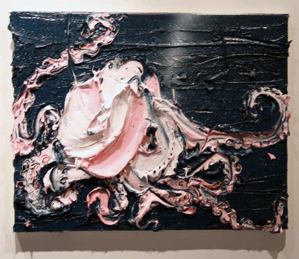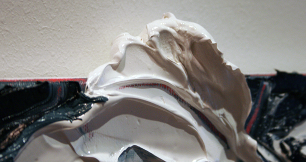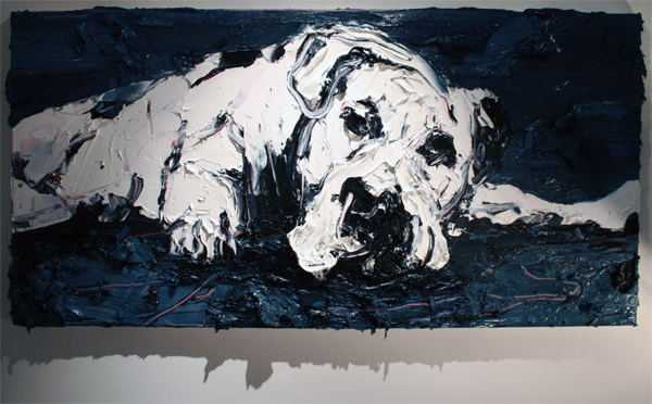 Simon Schrikker (1973) doet anno nu iets soortgelijks. Hij schildert geen honden, of octopussen. De ruimtelijkheid van de verf lijkt die honden op te roepen. De materie die beeld wordt, of juist materie blijft dus. De grens tussen sculpturaal en platte vlak is dus ook enorm onduidelijk in zijn werk. Dat geeft het werk meer lading dan een normaal plat schilderij van een hond of iets anders. De link met Marc Mulders mag dan ook best gemaakt worden. Beide stoeien met de materie van verf om daar een beeld uit te destilleren. Verschil is echter wel dat het bij Schrikker meer om de materie en het spel met die voorstel lijkt te gaan, en Mulders meer een beeld ruimtelijk probeert te maken. Een goed verschil is dat bij Schrikker de zwarte leegte van de open kaken van de haai juist een dikke klodder verf is ten opzichte van de witte tanden. Mulders zou waarschijnlijk juist die tanden meer naar voren hebben doen laten komen. Vandaar in deze blogpost ook veel aandacht voor detail, ook omdat het eigenlijk niet te fotograferen is.