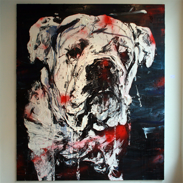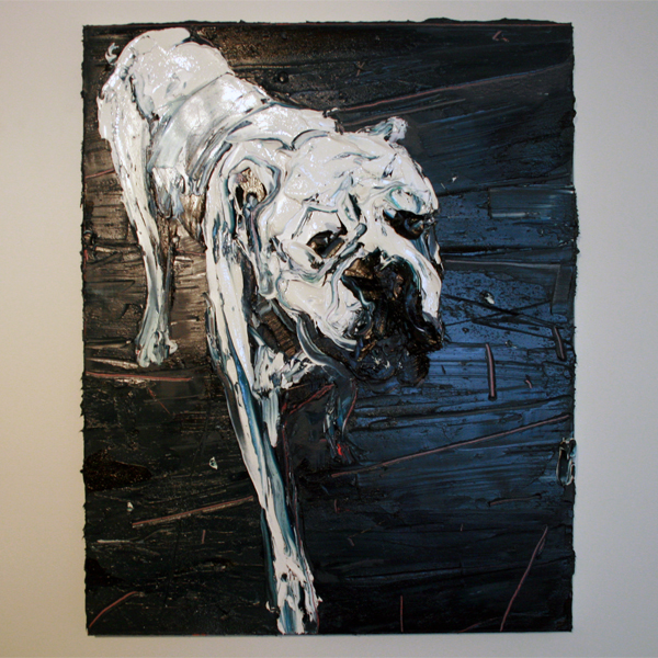 Leuk en goed dat je aandacht aan Schrikker besteedt! Ik zag wat van zijn honden bij Majke op de PAN, vorig jaar, en wilde er gelijk eentje kopen – maar m'n beurs was leeg (altijd goed als je naar een beurs gaat; er komt bijna altijd een 2e of 3e keer als de beurs voller is). In februari zag ik ze weer, op RAW in Rotterdam, maar daar hing alleen groot werk. 'Slagroom spuiten' noem ik deze vorm van schilderen: het herinnert me aan mijn manier van schilderbeeldhouwen als kind, als ik een taart mocht versieren met een spuitzak vol (banketbakkers)room. Niet de obligate sterretjes en streepjes, maar de vrije loop laten: hé, dit lijkt wel een wolf, of een wolk, of een konijn! Steeds heb ik bij Schrikker de neiging met mijn vinger langs de verf te gaan en hem daarna af te likken: fantastisch werk. Hij zou ook katten moeten gaan schilderen, dan koop ik – klein formaat – zelfs op krediet! [Hoe kijgt hij zijn werk overigens ooit droog?]