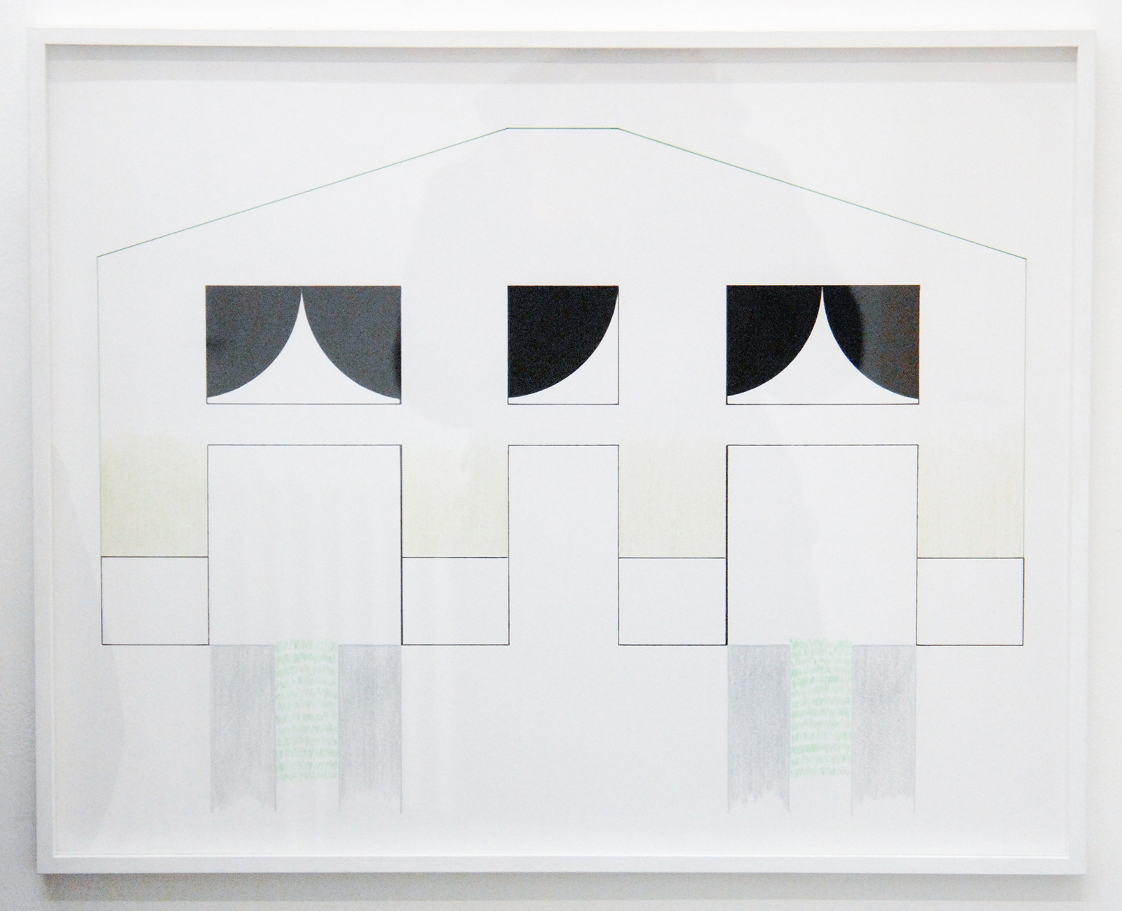 Dus, hoe betrek je die context actief in het beeld? Ik denk dat Elvire Bonduelle (1981) hier met haar schilderijen die doen denken aan gordijnen (die voor het venster hangen) een manier voor heeft gevonden. Ze ontkent de beperkingen van het schilderij niet, ze gebruikt ze door de toeschouwer even op het verkeerde been te zetten. Wie door de tentoonstelling lopend even niet oplet, zal het niet zien dat de schilderijen af en toe een kwart slag worden omgedraaid door de galeriehouder. Juist, de context in al zijn facetten speelt ineens een enorme rol. De werken blijven op zichzelf convergerend, maar door die handeling speelt de ruimte letterlijk ineens mee.