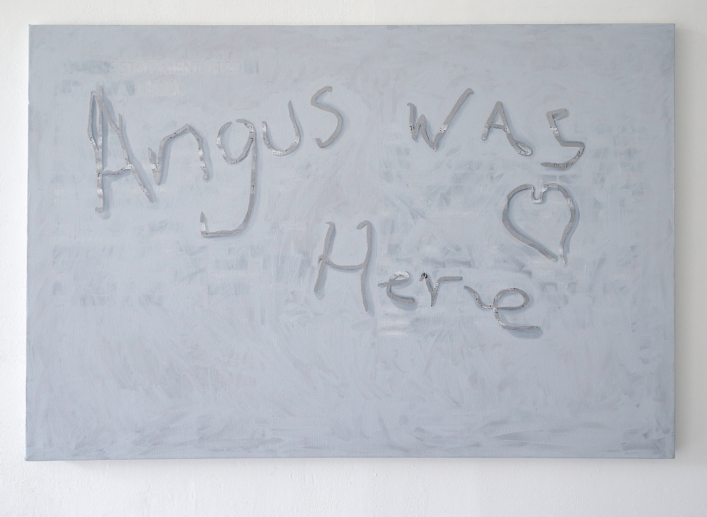 Henry Byrne – Angus was here (Appropriated painting of Angus Liao) – 91x137cm Vinylletters, acrylverf en olieverf op linnen