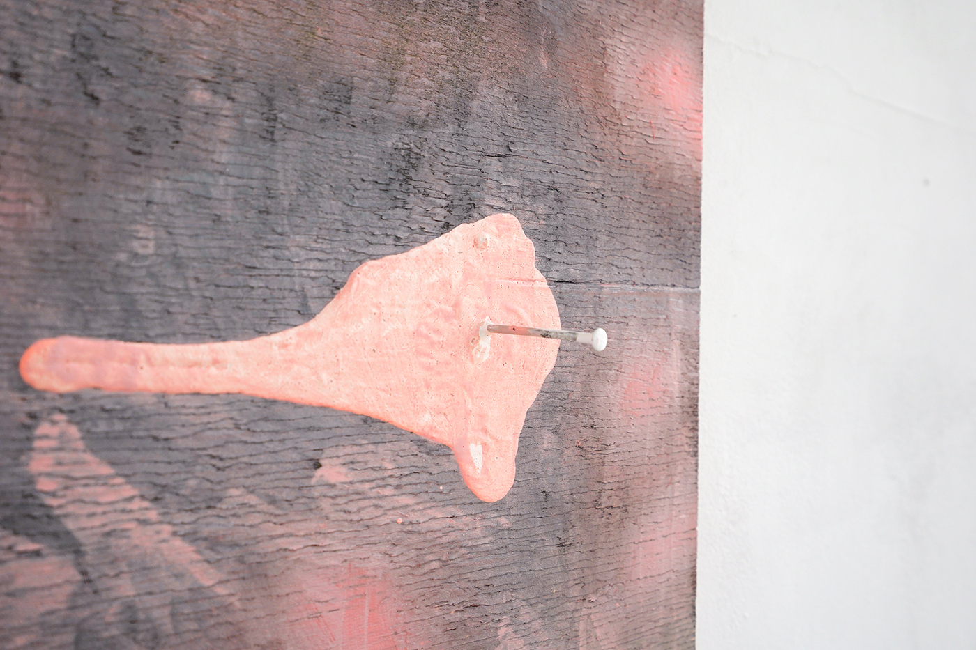 Henry Byrne – I’m Done With It (Appropriated painting of Ottokaji) – 50x42x7cm Spuitbus, olieverf, hout en spijker (detail)