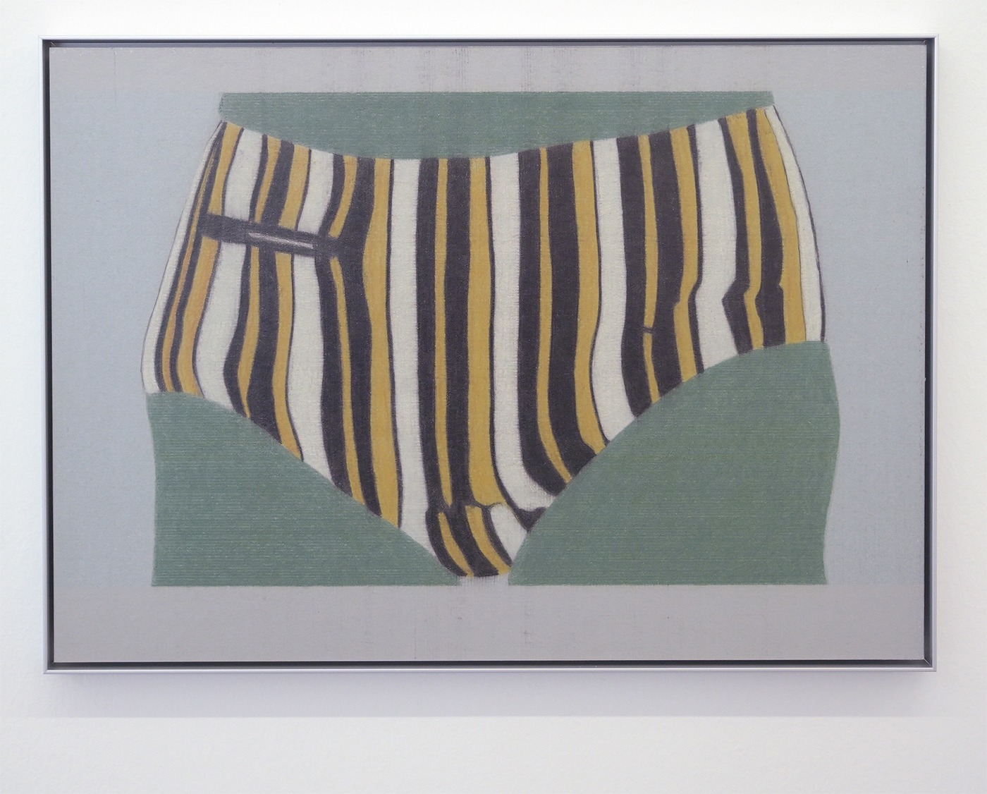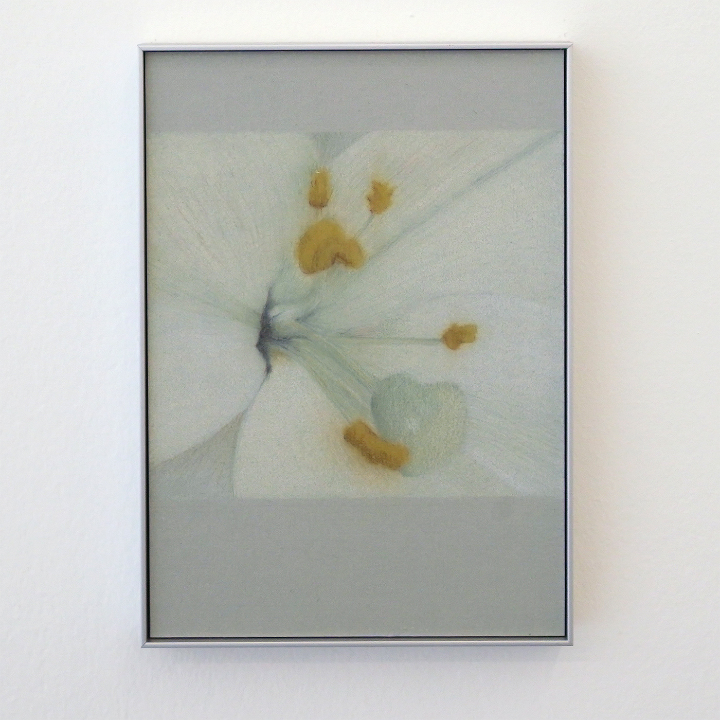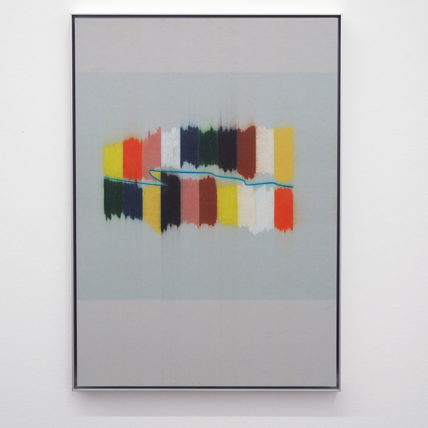Eén van die presentaties is die van Johan de Wilde (1964). Het zijn veelal kleine kleurpotlood tekeningen op bescheiden formaten, A4 (29,7x21cm) of A6 (14,8×10,5cm). Werk dat op het eerste gezicht een fotografisch achtige kwaliteit heeft, alsof het geprint is. Pas bij nadere inspectie zie je het handwerk, de vegen van kleur die vertaal over het papier gaan. Alsof hij steeds met zijn handen in zijn werk gewreven heeft. Het geeft vooral de grafische Pars Pro Toto-reeks werken een gloeiend effect. De gekleurde balken zinderen in de grijzige achtertoon.