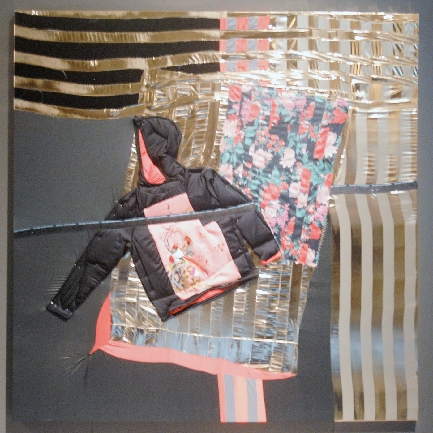 Wouter Paijmans - Bomber Hoody - 200x200cm Polyester textiel, zijde, draad, punaise en lakverf