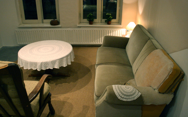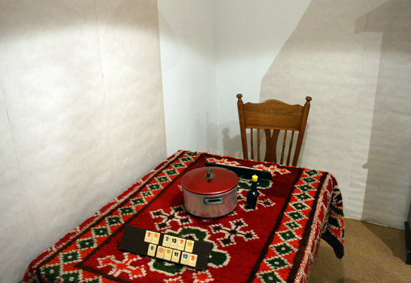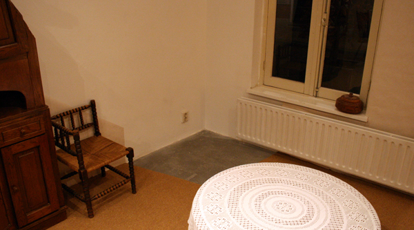 Een andere manier van een ruimte bezetten is deze te bezitten. Hilde Peters ‘reconstrueert’ een ruimte die ze zou kunnen bezitten, maar niet geheel. Niet alle ruimte wordt toegeëigend. Of zouden het ontbrekende geheugens kunnen zijn? Geslaagd interieur dat riekt naar nostalgie, maar het waarschijnlijk net niet is. Niet alles klopt namelijk, niet in de zin dat de bank niet af is, maar wel dat er een spel op tafel staat, tezamen met de soep?