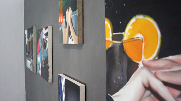 Ivor Helberg Dittrich toont aan een grijze wand wat schilderijen en een tekst. De tekst is opvallend omdat het direct doet vermoeden het niet enkel en alleen over de schilderijen gaat.