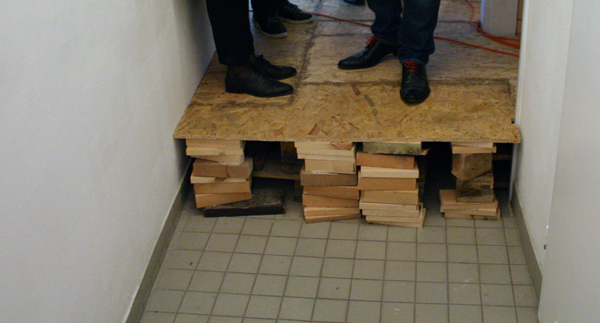 De ruimte kan ook bezet worden door de toegang ertoe te ontzeggen. Claire van Lubeek plaatst een groot houten bord op de plaats van de deur. Eventueel kan men zich naar binnen wurmen onder de plaat door. Een erg sterk statement dus.
