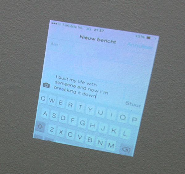 In dit geval is niet direct duidelijk waarom deze 4 jonge kunstenaars aan Charlotte Dumas (1977) gekoppeld zijn. Een duidelijke mentaliteit los van algemeenheden is er niet. Het zijn niet allemaal fotografen al zou je wel kunnen zeggen dat ze allemaal zich wel op een bepaalde manier verhouding tot het vastleggen van beelden. Een overkoepelende gevoeligheid is er even zo goed niet echt, al zitten ze elkaar hier absoluut niet in de weg.
