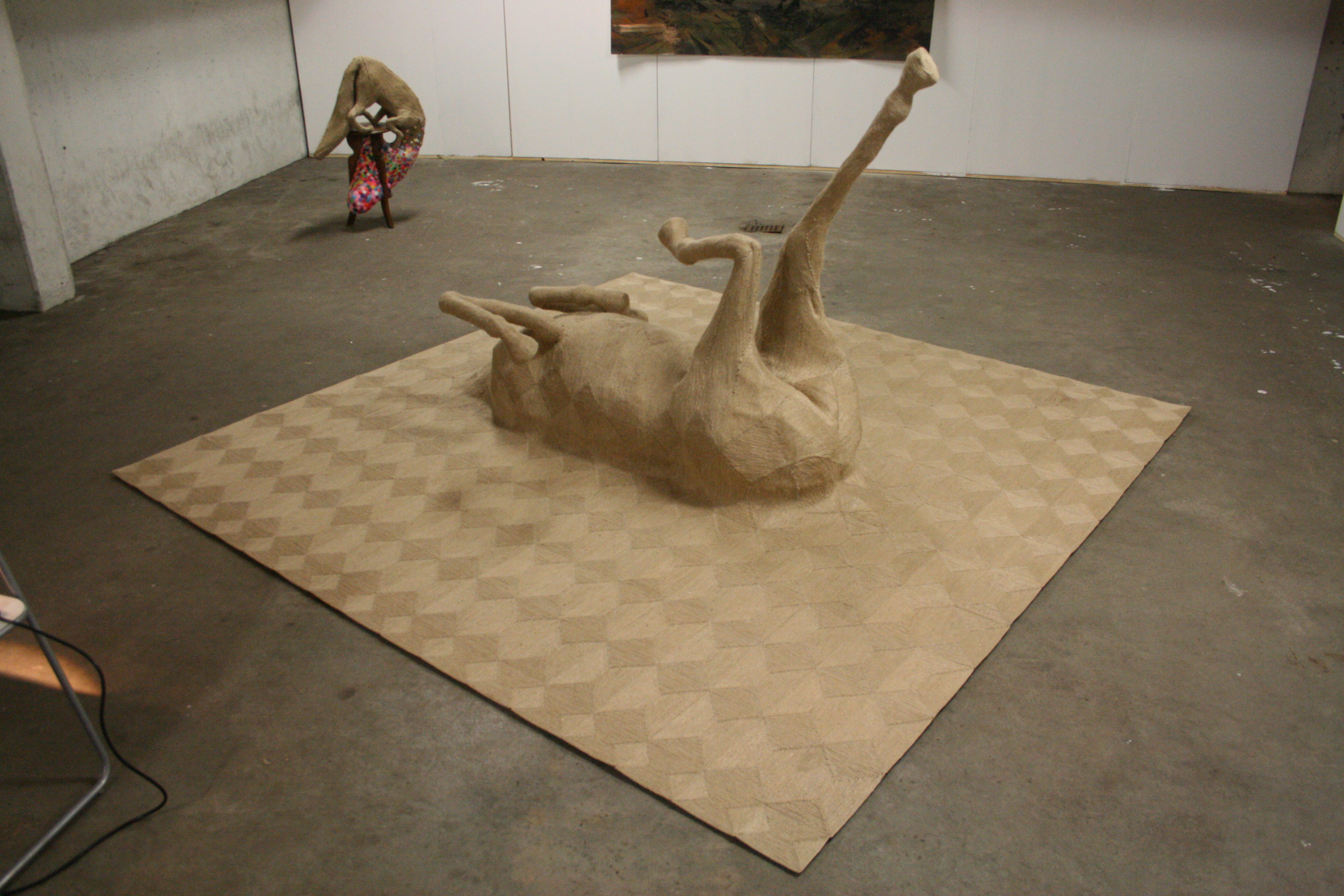 Sara Campos (en drie anderen) stampt een uur lang op klei om de grond onder haar voeten weg te zien gaan en presenteert dat bij de doucheruimtes, het geluid galmt op een wijze dat het klinkt alsof de douches aanstaan. Erg mooi.
