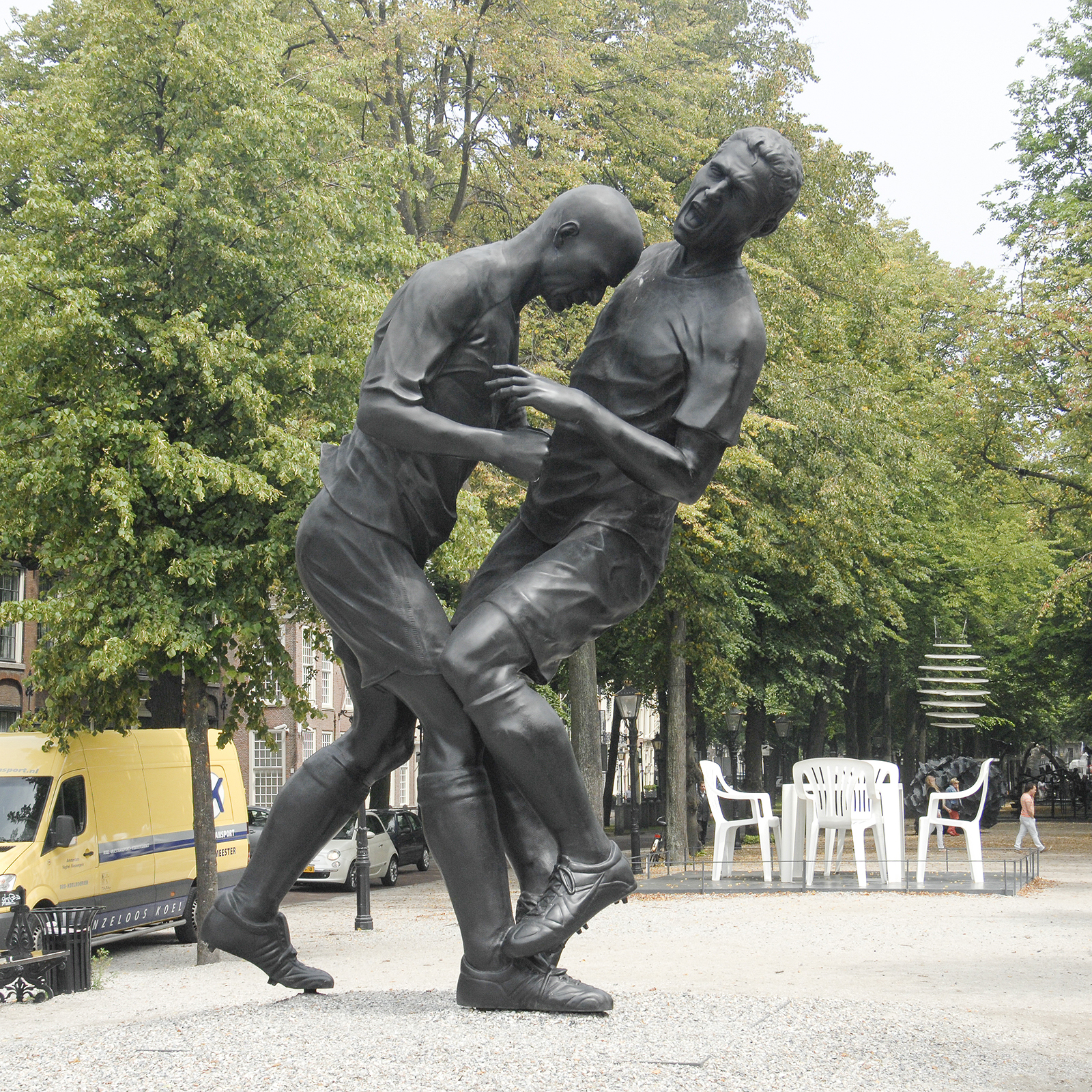 Sterker nog, veel werken doen denken aan andere kunstenaars: Oldenburgh, Robert Therrien, Penone, Koons, verdorie een paar 100 meter verderop ligt een werk in een tuin dat er uit ziet als het voorbeeld voor het werk van Castel hier bij de Lange voorhout. Alleen het werk van Abdessemed met de kopstoot van Zidane is overduidelijk van een orde die je hier in Nederland niet zou treffen. Hier zou eerder de kopvlucht van Van Persie gebruikt worden dan Zidane. Natuurlijk is de kwestie van originaliteit een problematisch gegeven, maar het moge duidelijk zijn dat de relevantie en urgentie van deze sculpturen niet duidelijk is.