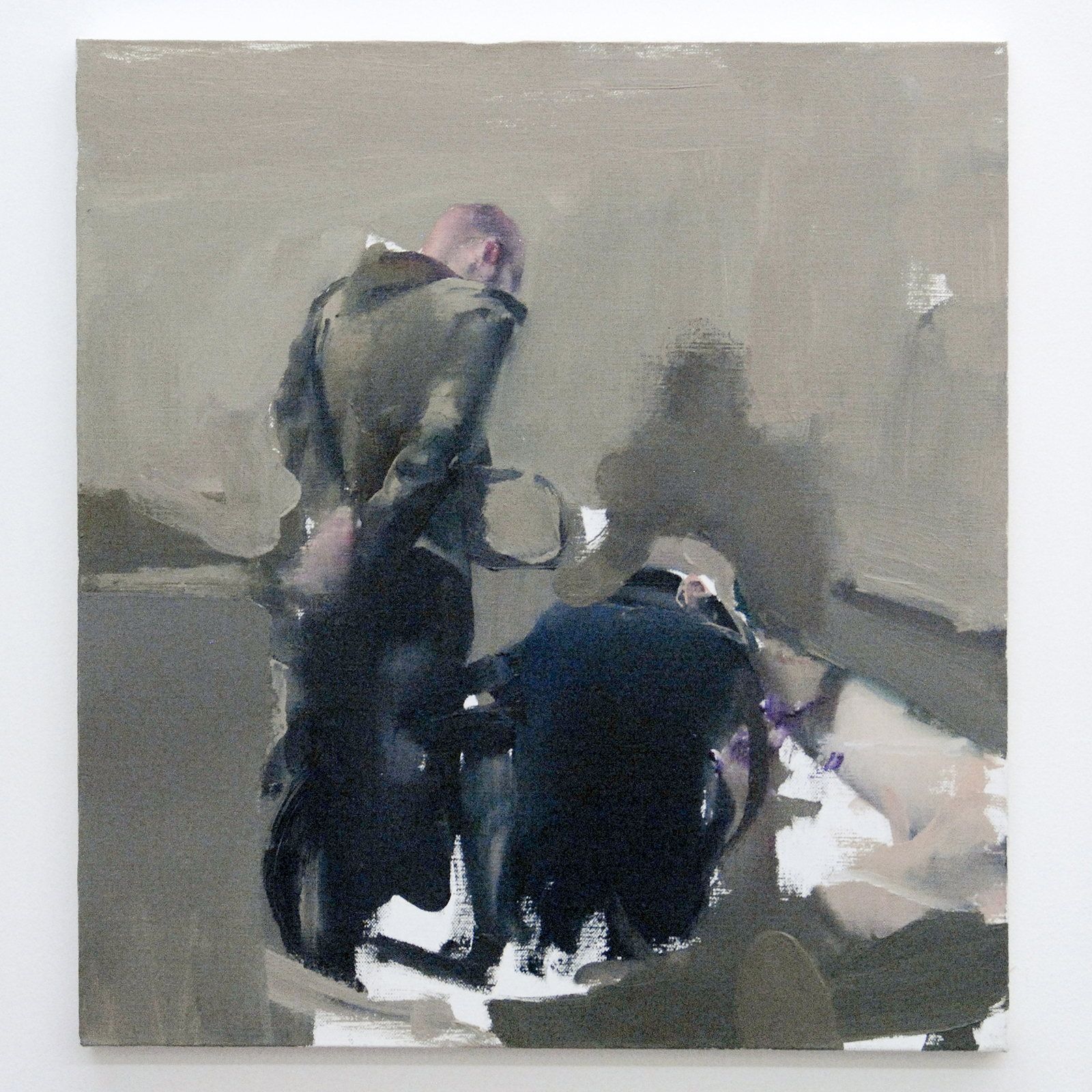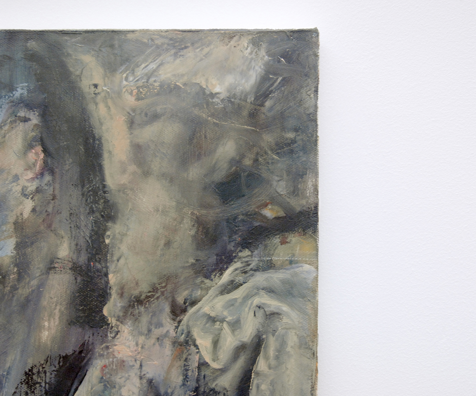 De ruimte is klein, niet heel veel meer dan een kleine huiskamer. Er hangen doorgaans dan ook niet zo heel veel werken, 2 grote werken of een handvol kleine en gevoelsmatig is het er al snel vol. Nu hangen er nog net geen tiental schilderijen op handzaam formaat. Aan de ene zijde werk van de jonge Alin Bozbiciu (1989), aan de andere zijde de oudere Corneliu Brudascu (1937).