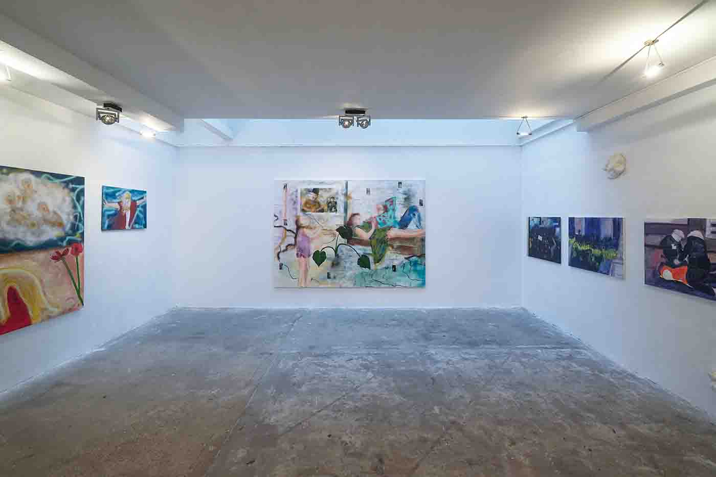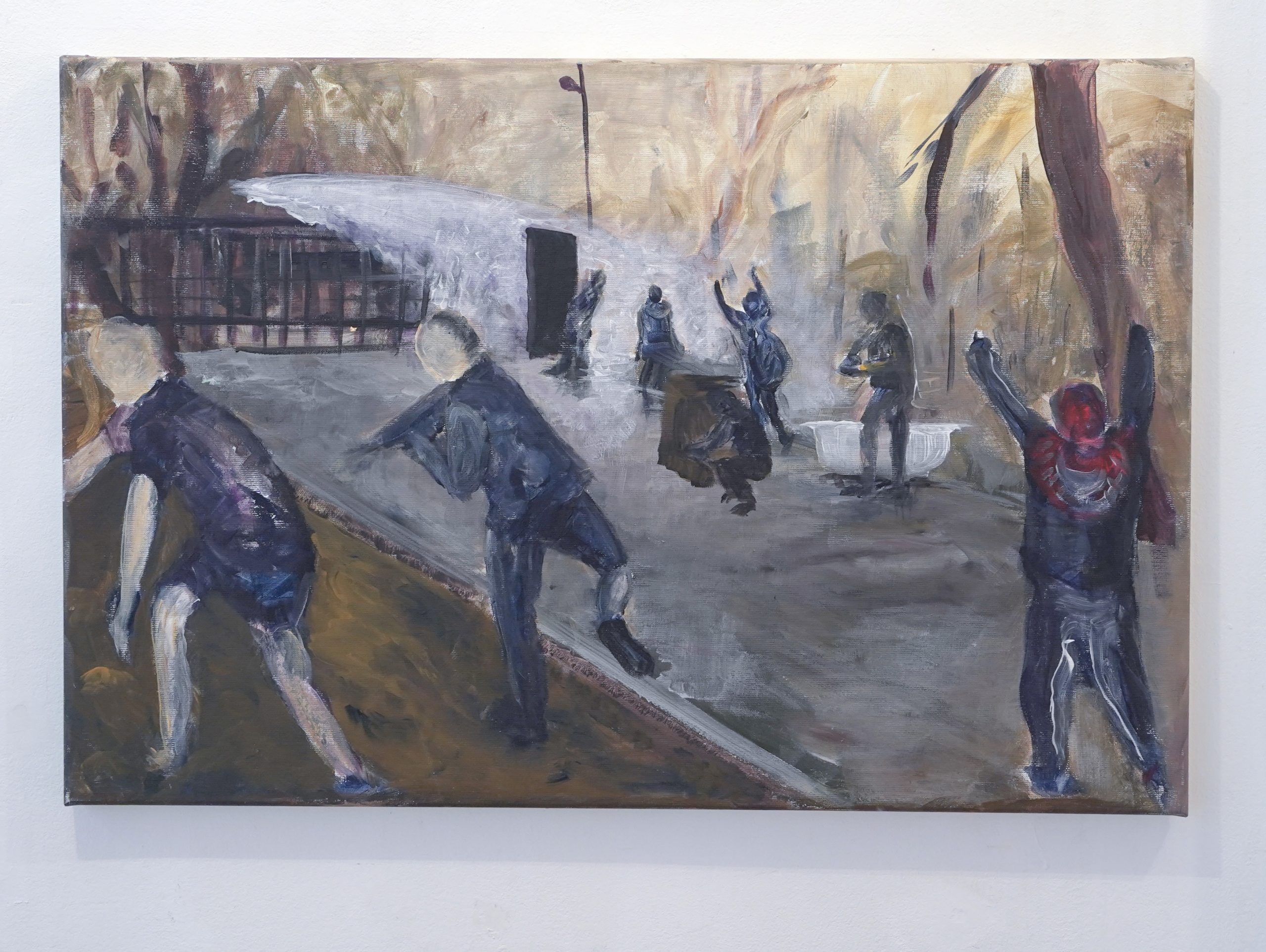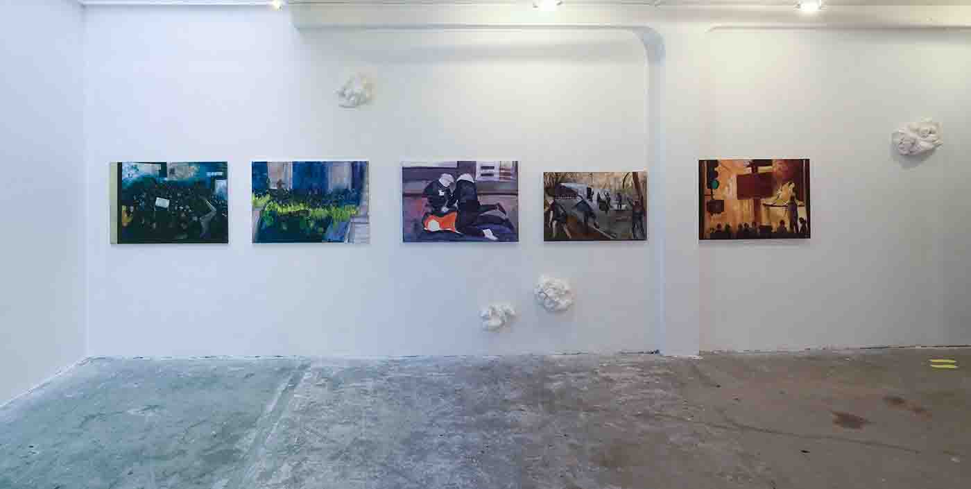 In een werk van Atousa Bandeh (1968) heeft de kunstenaar zichzelf afgebeeld als nieuws presentator. Alsof ze zelf ook in gortdroge toon het nieuws aankondigt. En dat gebeurt dan ook, in verschillende schilderijen zien we de rellen, protesten, soaps en films en andere ellende die via het beeldscherm voorbij komt. Maar, ook de veilige thuiskamers. Het werk lijkt steeds te vragen hoe moeten we ons verhouden tot de wereld om ons heen.