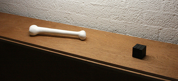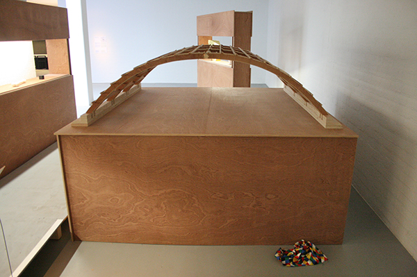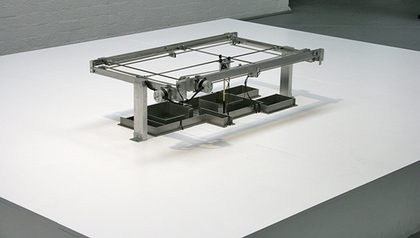 Het werk van Paul Devens behoeft enige uitleg, hier op de foto is een metalen bak met water te zien in de vorm van het museum. Een soort pen roert door het museum heen en maakt zo nu en dan door het water heen contact met een sensor. Deze sensor activeert dan heel even geluiden uit Venlo op de corresponderende plek in het museum. Een eenvoudig concept wat op nagenoeg alle locaties valt toe te passen. Het behoeft geen extra uitleg dat het toch voor verassende effecten zorgt in de museumzalen. Maar ook de metalen bak zelf werkt als sculptuur ook erg goed.