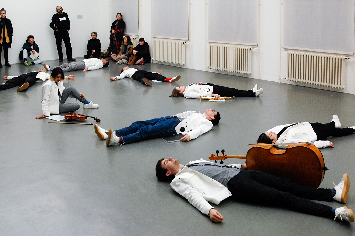 Allereerst het hoogtepunt van de avond. Ik was al eens voor niets Witte de With ingelopen, maar dit keer was het laatste optreden van het team van Kunsthalle for Music. Hier wordt in een vier uur slopende marathon een greep van klassieke kunst-muziekstukken gespeeld. Denk aan Philip Glass, maar ook Duchamp, Steve Reich en Guido van der Werve.