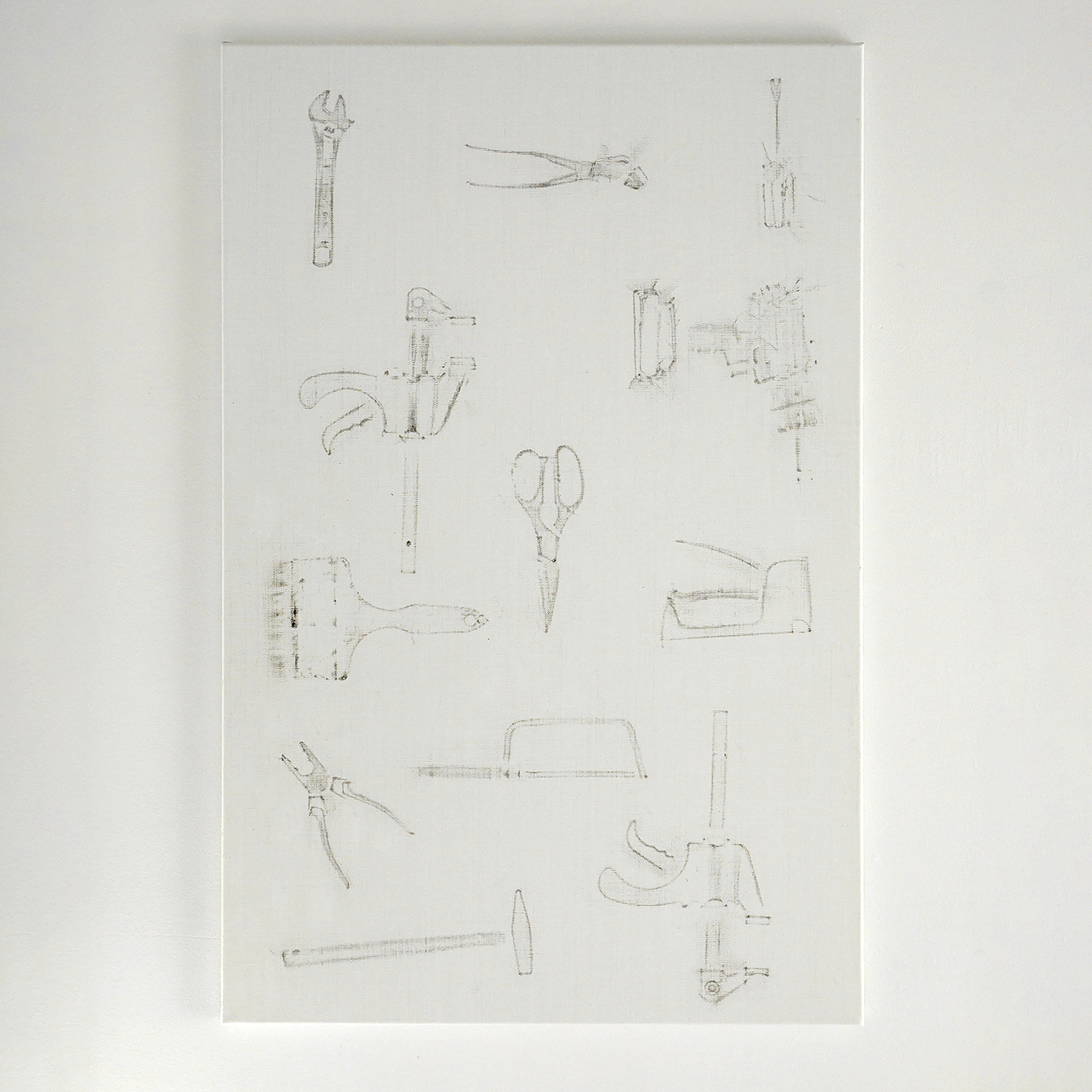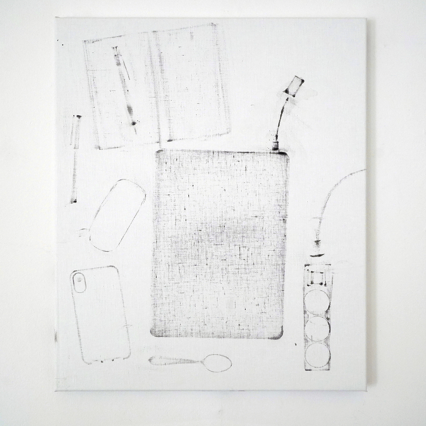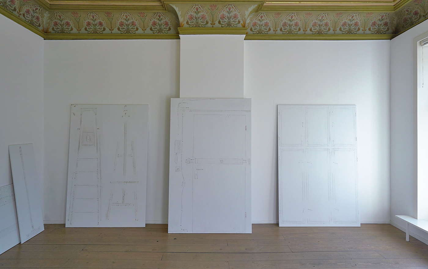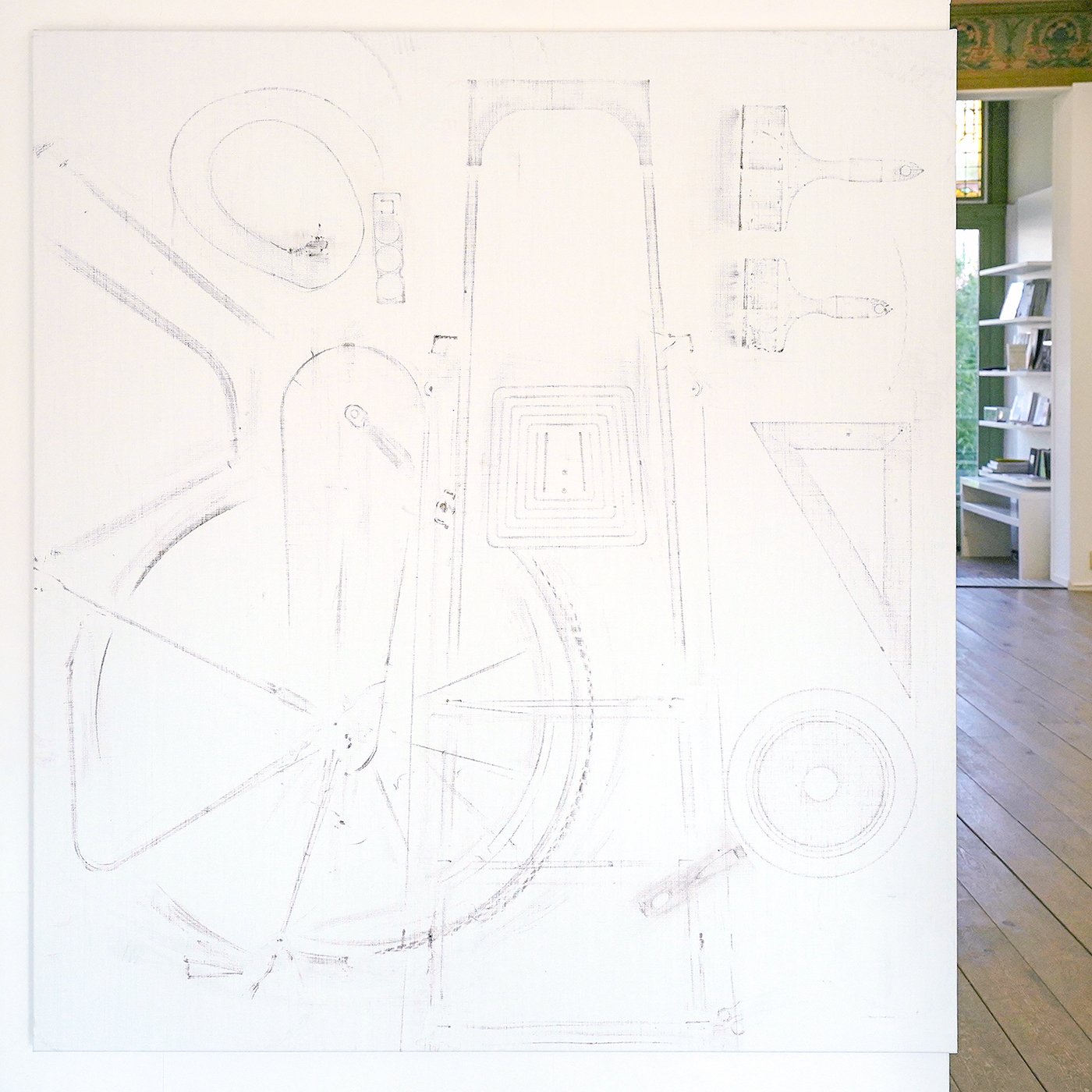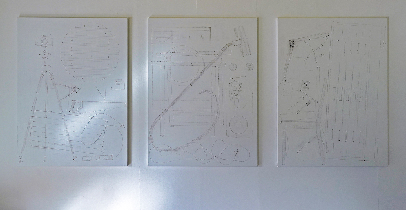Hutsch spande doeken op en plaatse daarop alle materialen die ze in het atelier aantrof. Een trapje, een ezel, een kwast, een fotostatief, een stofzuiger, noem het maar op. Allemaal dingen die je in veel ateliers zult aantreffen. De werken vormen niet alleen een inventarisatie van wat er aanwezig was, maar ook een indicatie van wat er mogelijk is in dat atelier.