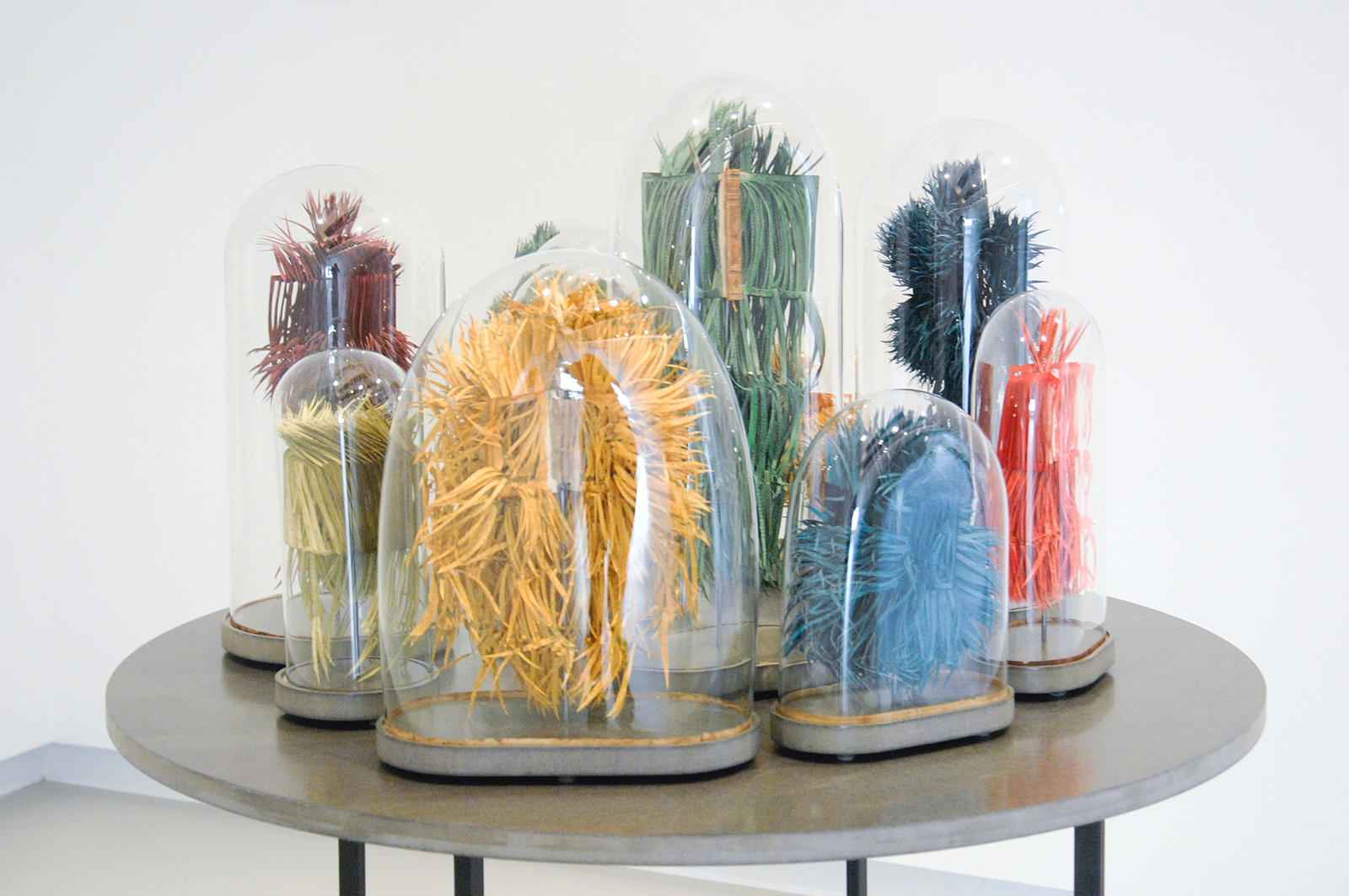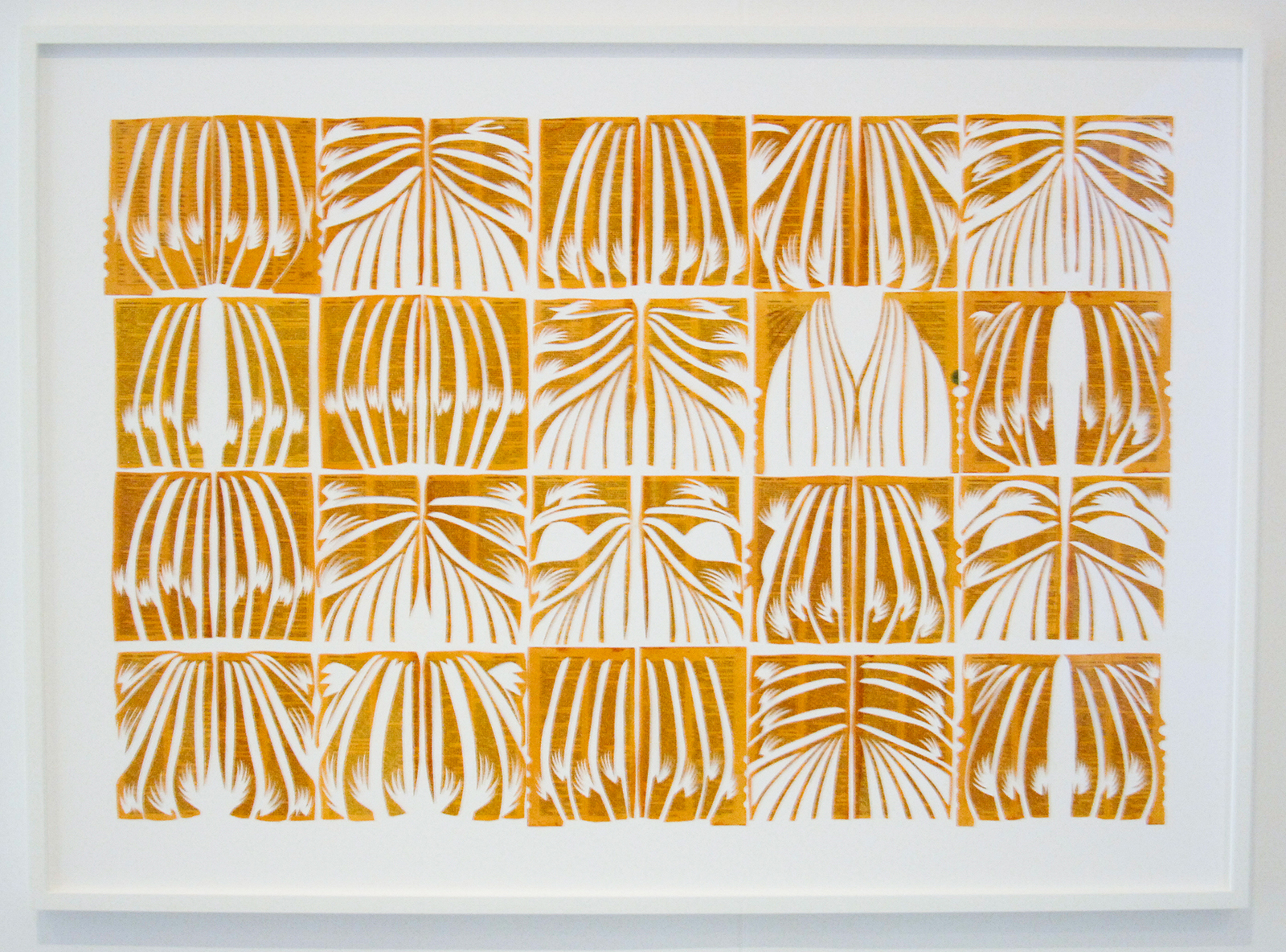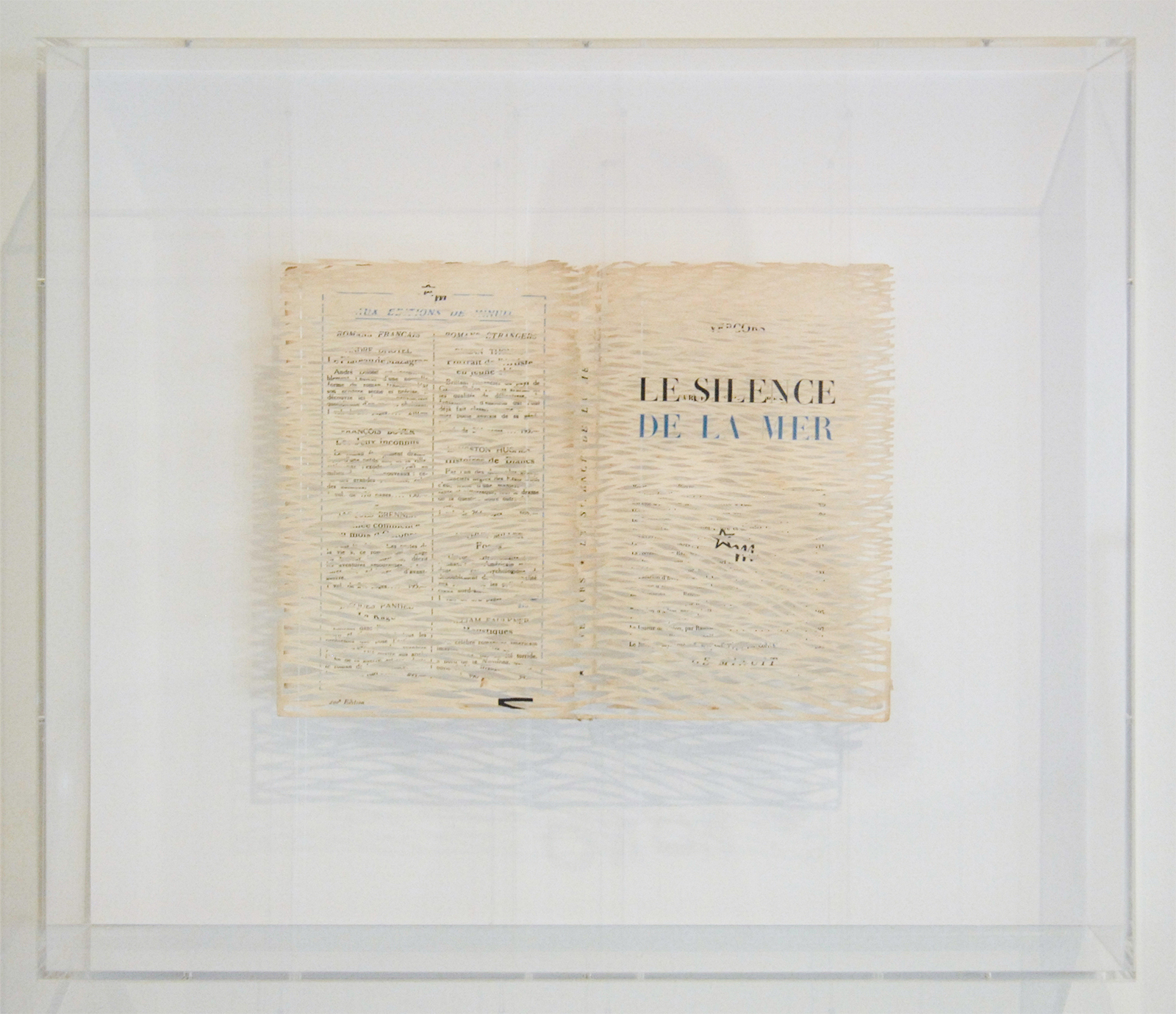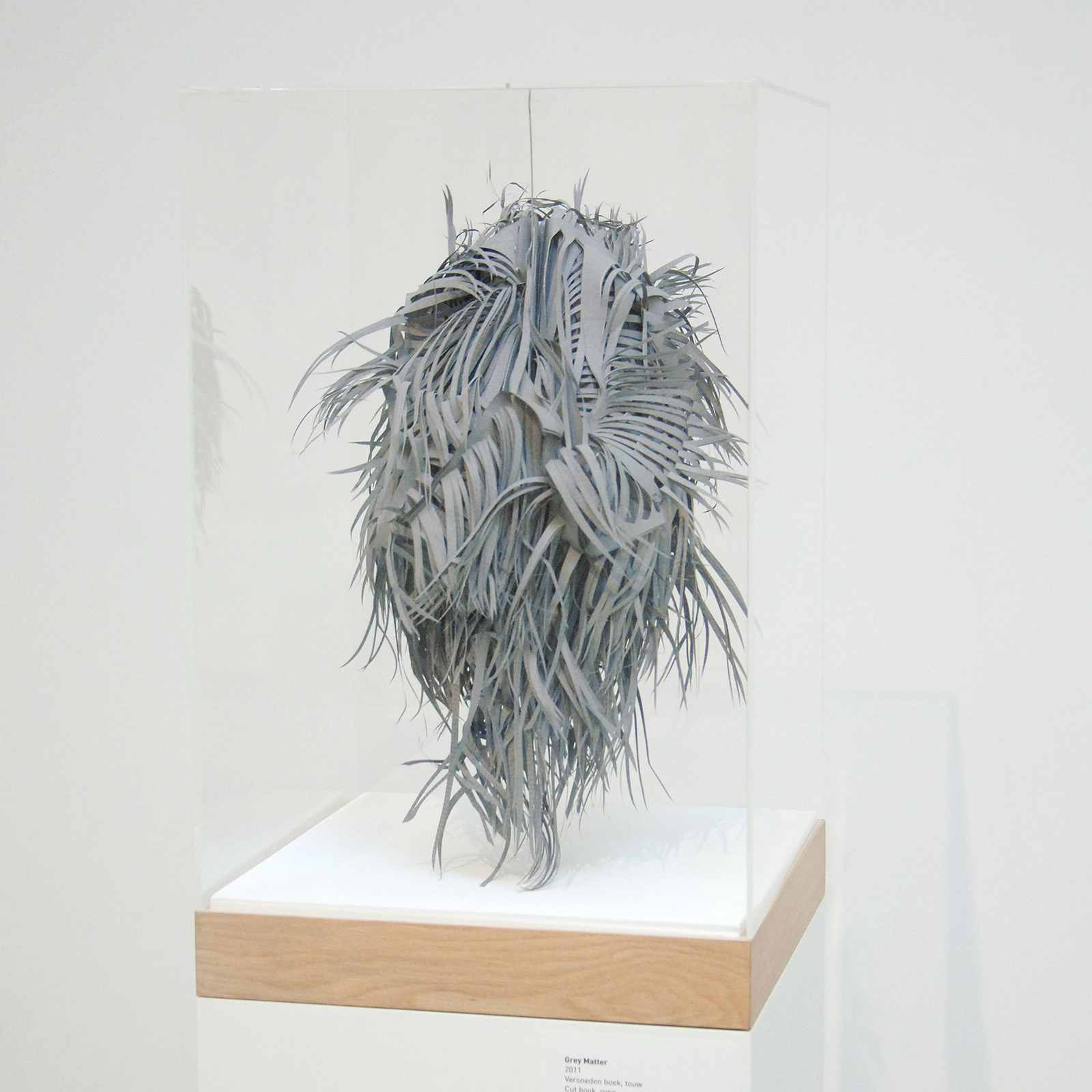 De breedte van het werk houdt op met die esthetiek. Ondanks de diversiteit aan vormen en formaten worden de werken al snel inwisselbaar voor elkaar. Haar techniek is een sausje dat over een vorm heen gegoten kan worden. Mooi effect, maar los van daarvan blijft er maar bar weinig over. Na één versneden boek geloof je de andere ook wel. Ze had nog iets met de inhoud van het boek kunnen doen maar verder dan de titel komt het niet. Dat de hoeveelheid werk op een groot canvas indrukwekkend is, is ook een weggevertje. (Het persbericht kon het ook niet laten te vermelden dat ze er wel twee maanden aan gewerkt had als legitimering van het werk) De hele tentoonstelling schreeuwt bijna van de inhoudelijke armoede.