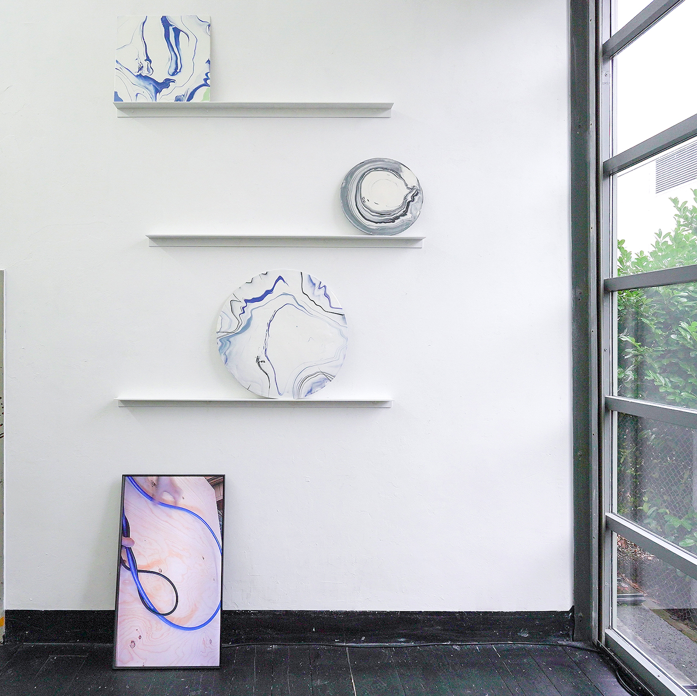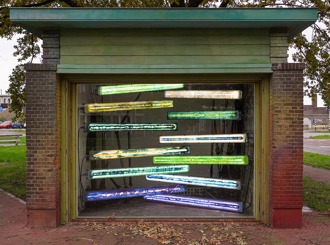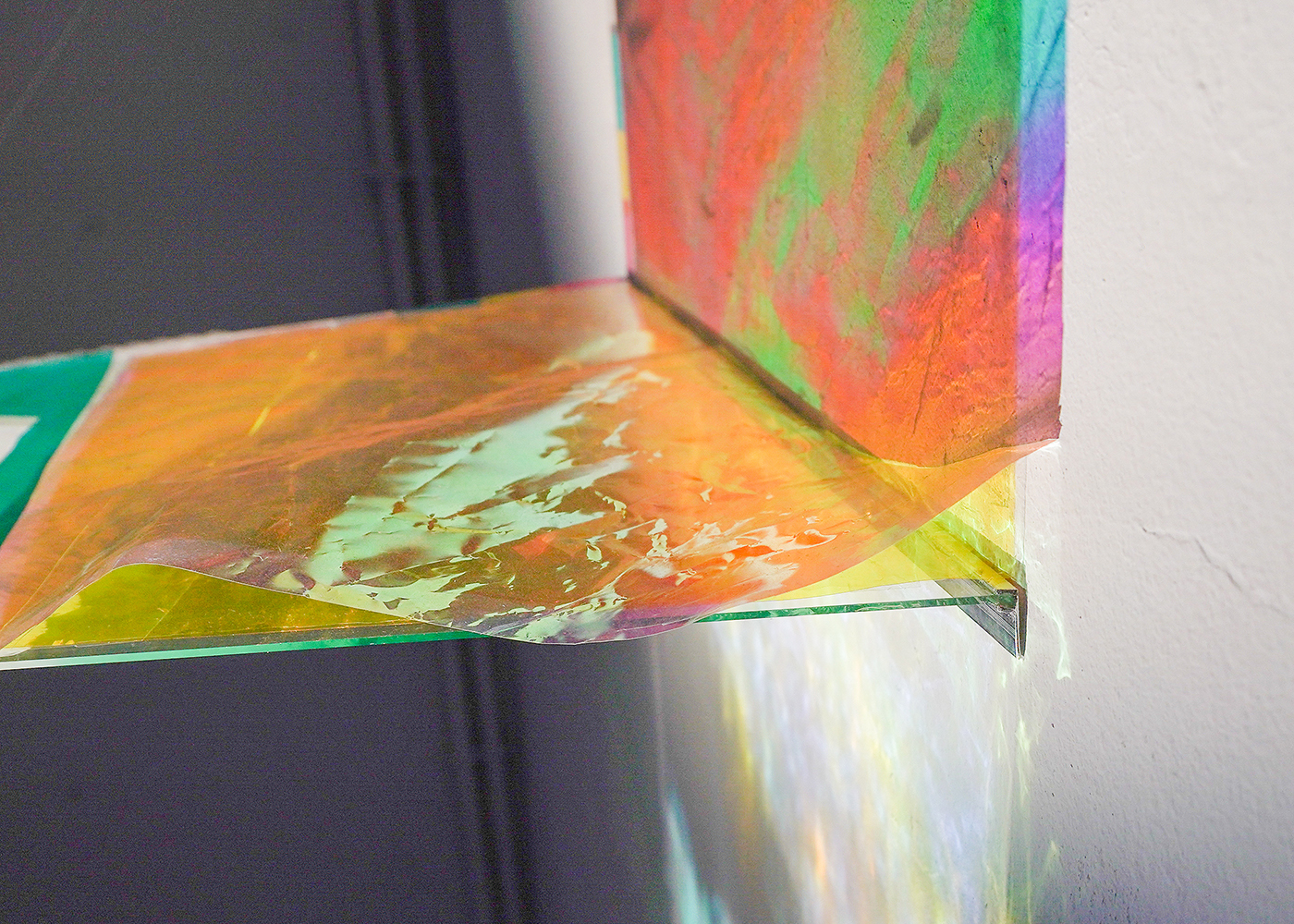 Hoewel Omstand een grillige tentoonstellingsruimte is, doordat het bestaat uit verschillende soorten ruimtes die niet aaneensluitend zijn, vormen al deze werken een mooie reeks van tonen die een relatie met elkaar aangaan. Er is een belangrijke rol voor kleur, textuur en materie. Soms komt de kleur van het licht (3 kunstenaars gebruiken lichtbronnen als onderdeel van hun werk), soms van het materiaal zelf en in een enkele uitzondering in de vorm van verf. Net als bij de bakplaat en mijn koelkast hebben ze niet heel veel met elkaar te maken maar ervaar je dat ze samen iets doen met elkaar.