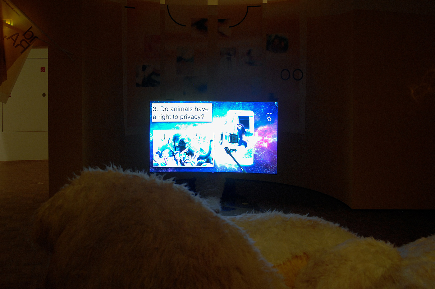 Het werk van Rana Hamadeh is een deel van een opera. Ik had de pech middenin naar binnen te lopen en hoorde een pianola helemaal uit zijn dak gaan. Het geheel is een onsamenhangende presentatie die qua toonzetting doet denken aan het muzikale werk van Scot Walker. Juist het onsamenhangende karakter maakt het geheel dwingend en moet je bij de les blijven. Het maakt in elk geval nieuwsgierig naar de opera die de 14e en 15e in de Stadsschouwburg opgevoerd zal worden.