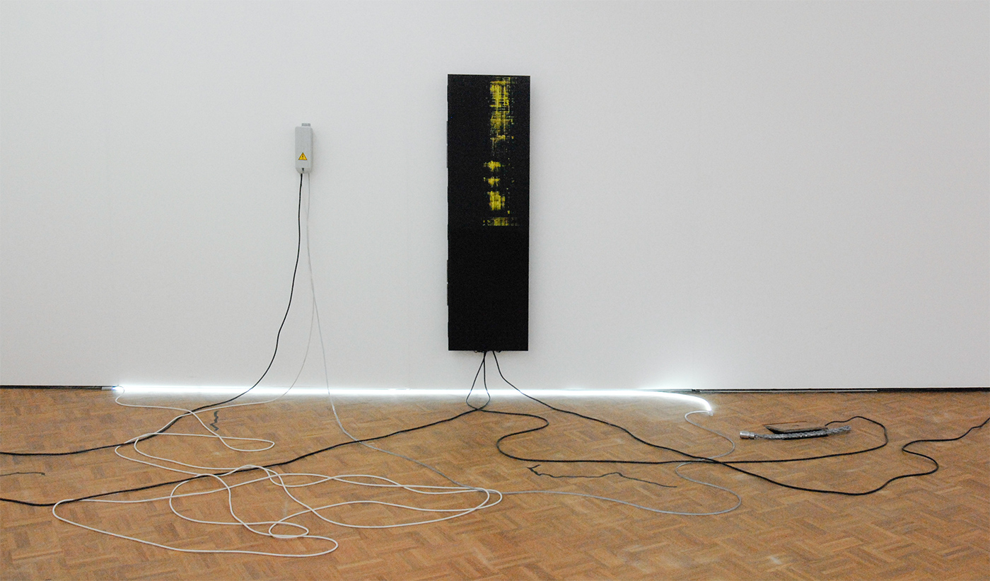 Wat opvalt aan hun presentaties is dat ze eigenlijk geen van allen singulair werk tonen. Het zijn totaalinstallaties met de nodige hoeveelheid stekkers en snoeren. Bij Saskia Noor van Imhoff is het nog redelijk beperkt. Ze gebruikt enkele neon en een paar beeldschermen voor het tonen van een spectrogram. Daarnaast toont ze een aantal ingrepen die allemaal op associatieve wijze omgaan met vraagstukken rondom het tonen van wat kunst zou kunnen zijn. Een half afgestripte oranje plexiglas plaat midden in de ruimte toont een doorkijkje naar een opslag waar semi-betekenisvolle objecten zijn uitgestald.