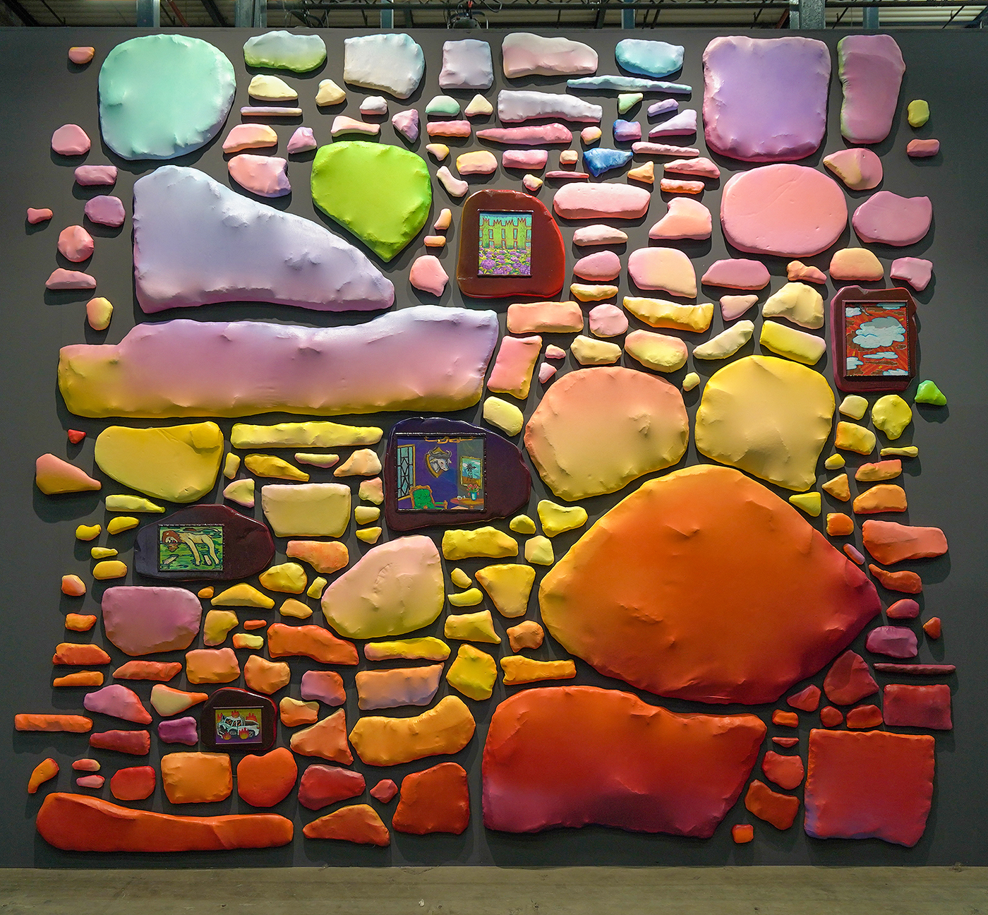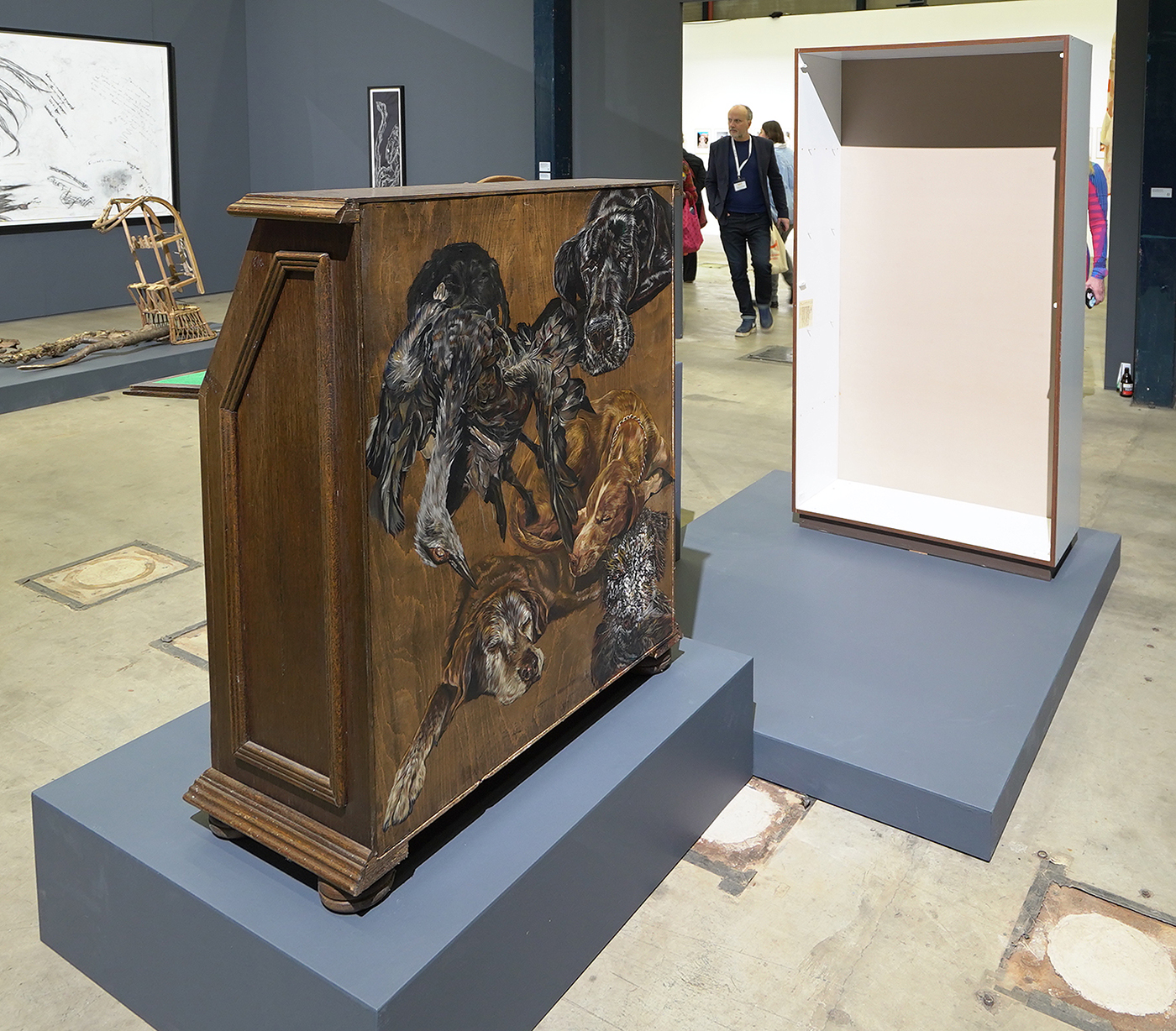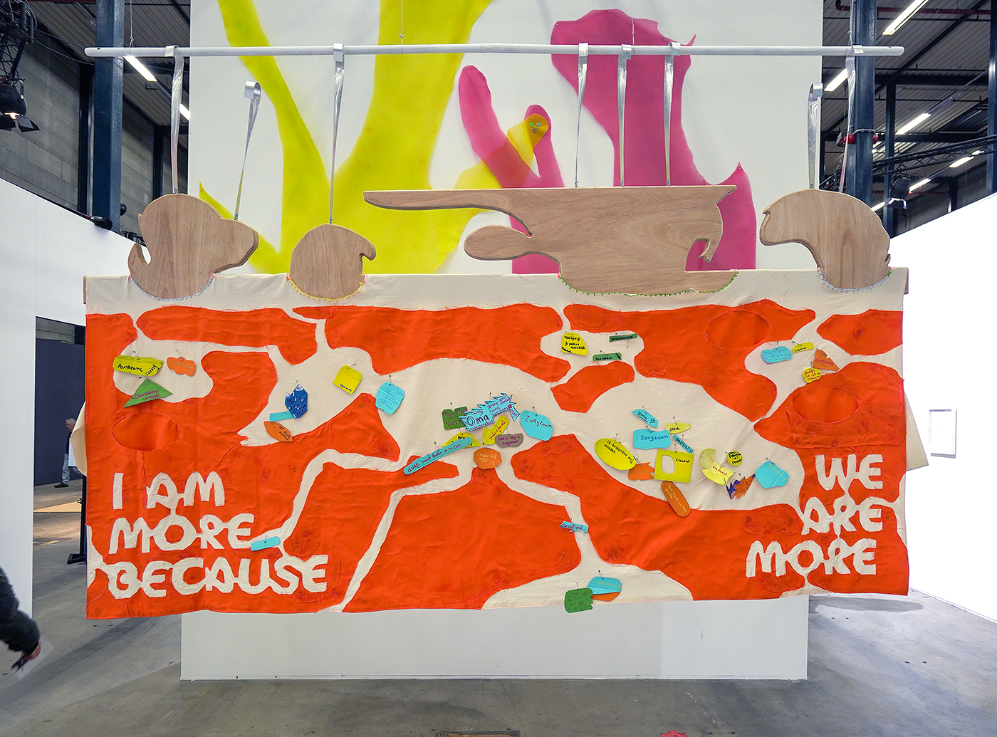 Wat vooral opvalt is dat waar de gewone kunstbeurs uitblinkt in de afwezigheid van statements, er hier opvallend veel grotere projecten te zien zijn. Denk bijvoorbeeld aan het werk van Annemarie Wadlow, Ian Skirvin, Michal Kruger, Kokou Ferdinand Makouvia of Cas van Deurssen. Stuk voor stuk flinke werken. Niet dat er geen ruimte is voor kleine intieme gebaren want die zijn er net zo goed zoals het werk van Dion Rosina die slechts een klein werk toont, of de bescheiden TV-schermen van Ahmad Mallah & Rebecca Lillich Kruger, of de textielwerken van Brownen Jones. En zo kan ik nog wel even doorgaan.