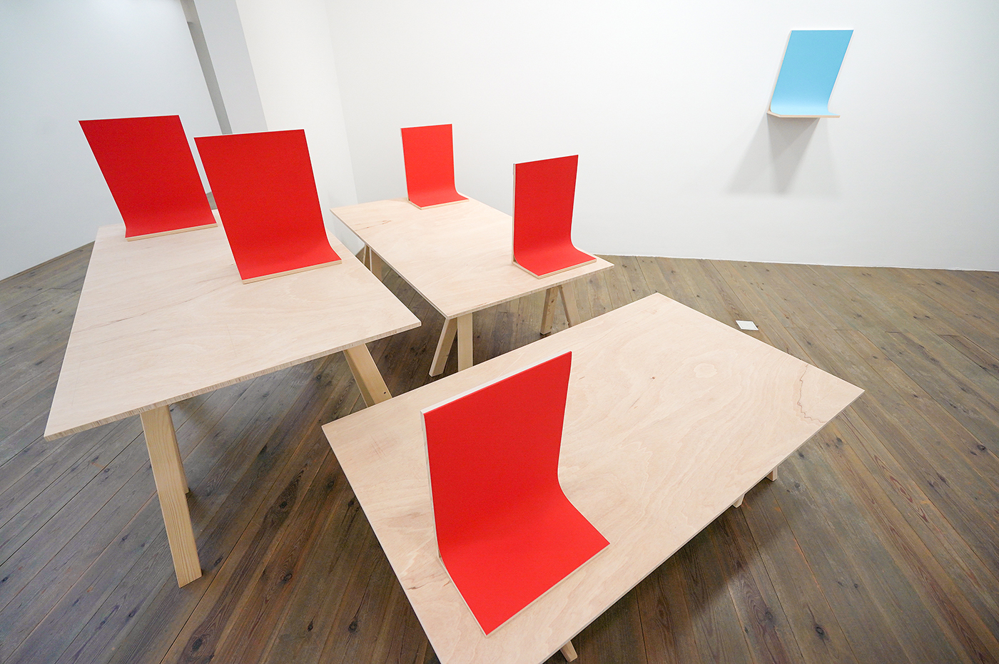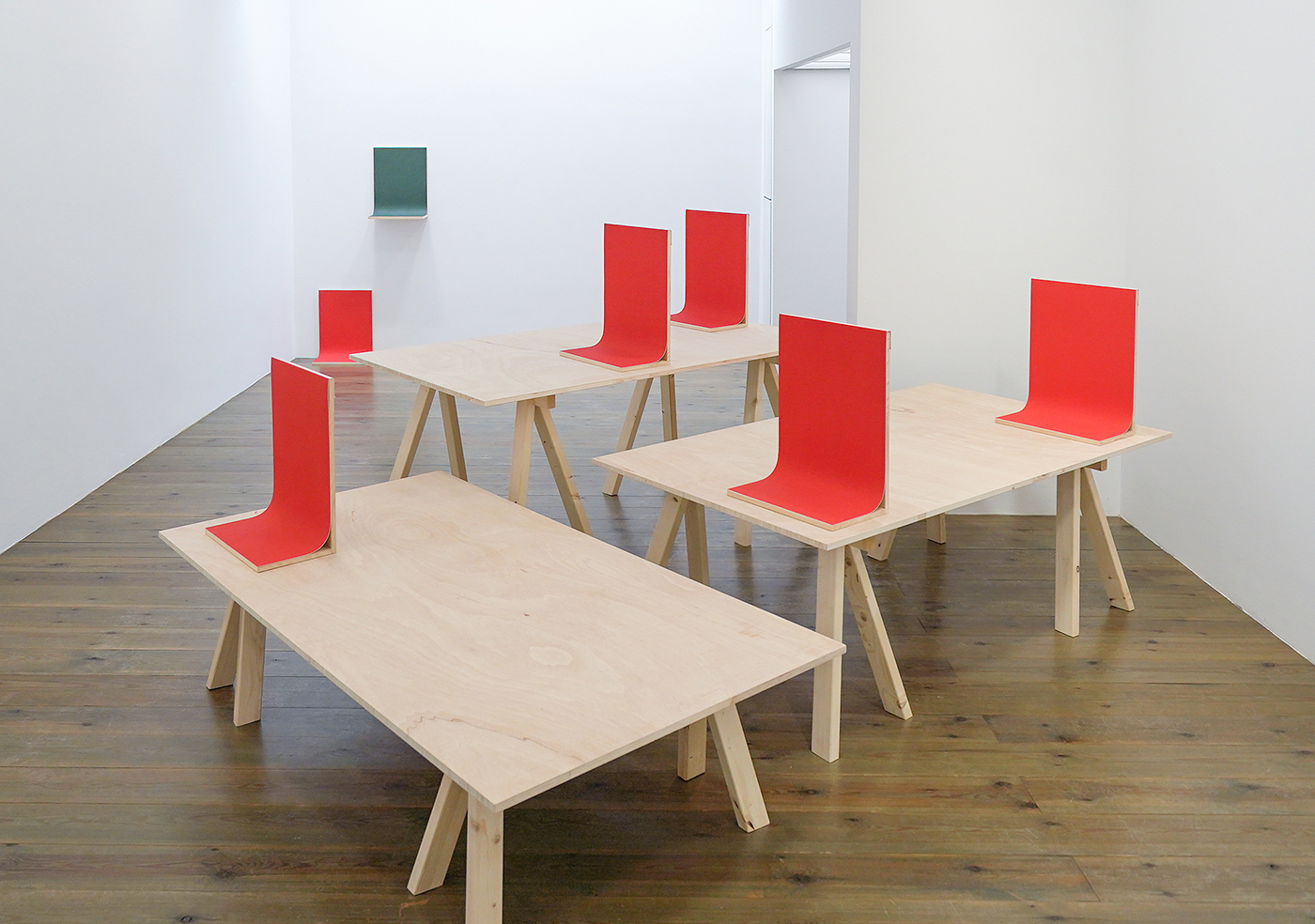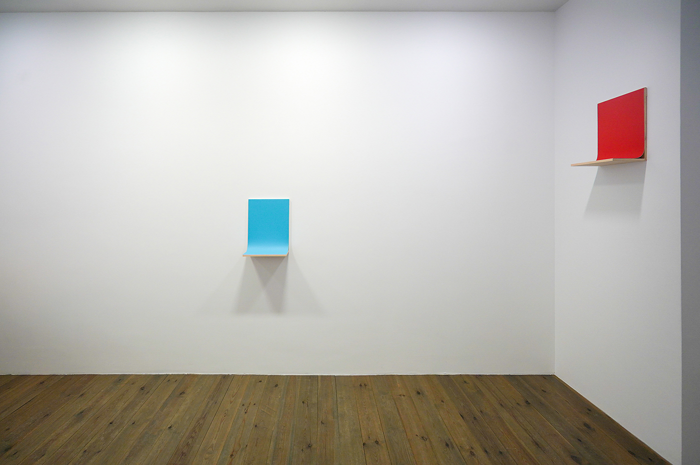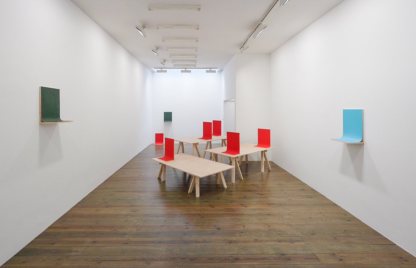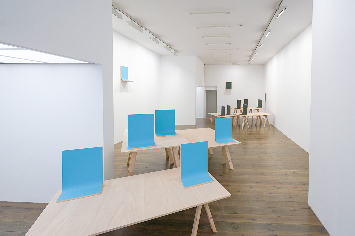 Het modulaire karakter is geen toeval. Bezoekers worden dan ook uitgenodigd de objecten een andere plaats te geven in de tentoonstelling. Ze zijn ontdaan van hun mythische status als een raam op een andere schilderkunstige werkelijkheid, ze stellen niets voor buiten zichzelf. Je ziet de werken voor wat ze zijn, objecten van kleur. In dit geval, rood, blauw en grijsgroen. Die kleuren doen natuurlijk iets, zeker in relatie tot elkaar. Door je te bewegen in de ruimtes veranderen de optische effecten van de ruimtes.