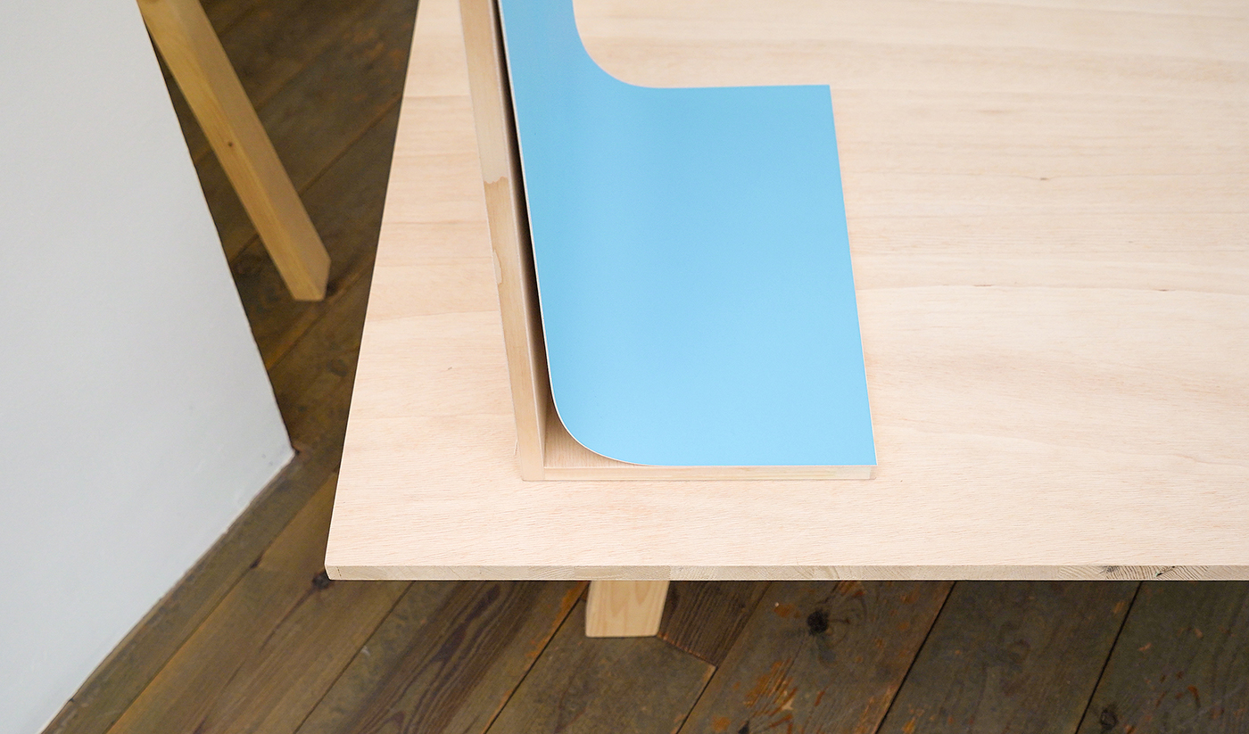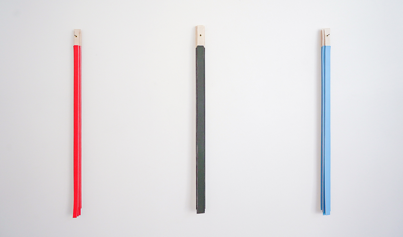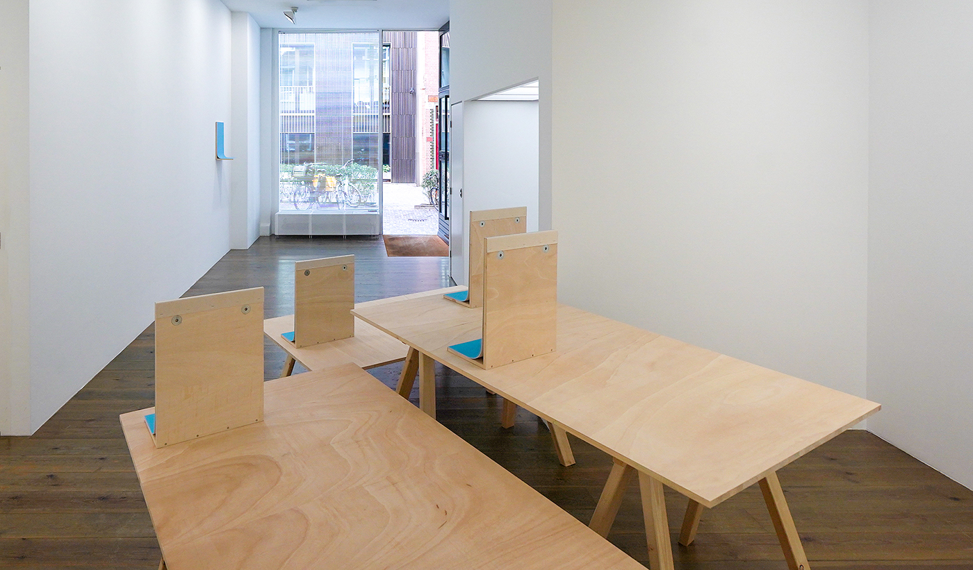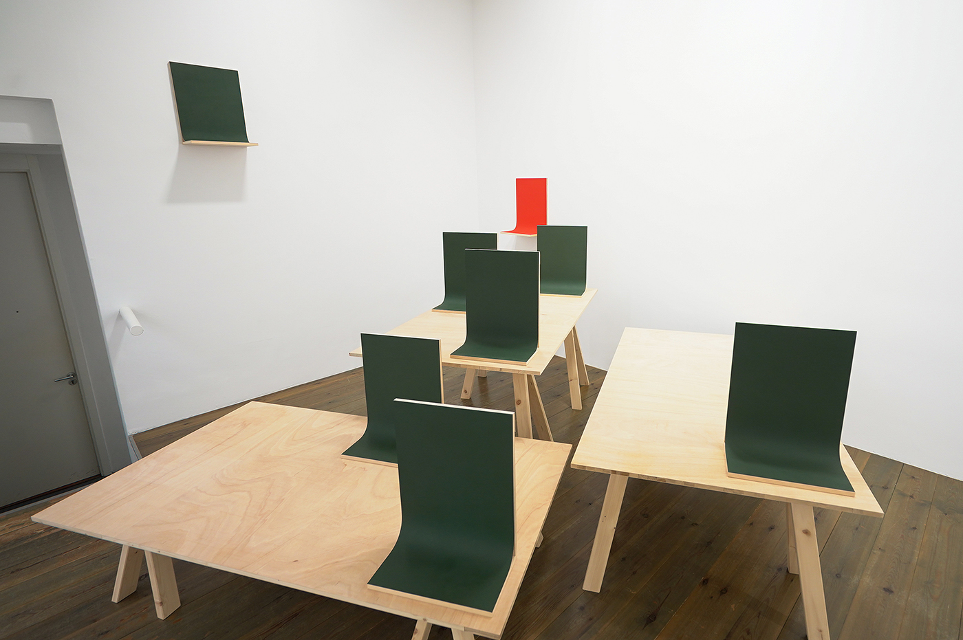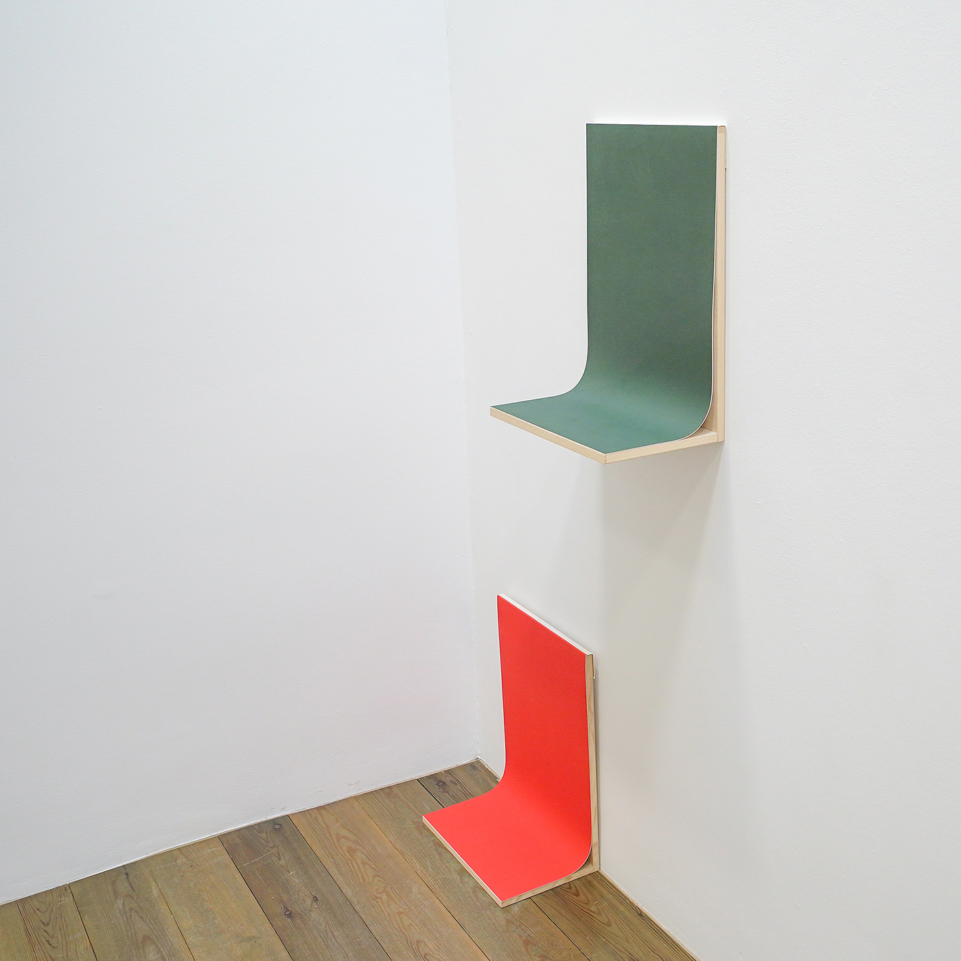 Het modulaire karakter is geen toeval. Bezoekers worden dan ook uitgenodigd de objecten een andere plaats te geven in de tentoonstelling. Ze zijn ontdaan van hun mythische status als een raam op een andere schilderkunstige werkelijkheid, ze stellen niets voor buiten zichzelf. Je ziet de werken voor wat ze zijn, objecten van kleur. In dit geval, rood, blauw en grijsgroen. Die kleuren doen natuurlijk iets, zeker in relatie tot elkaar. Door je te bewegen in de ruimtes veranderen de optische effecten van de ruimtes.