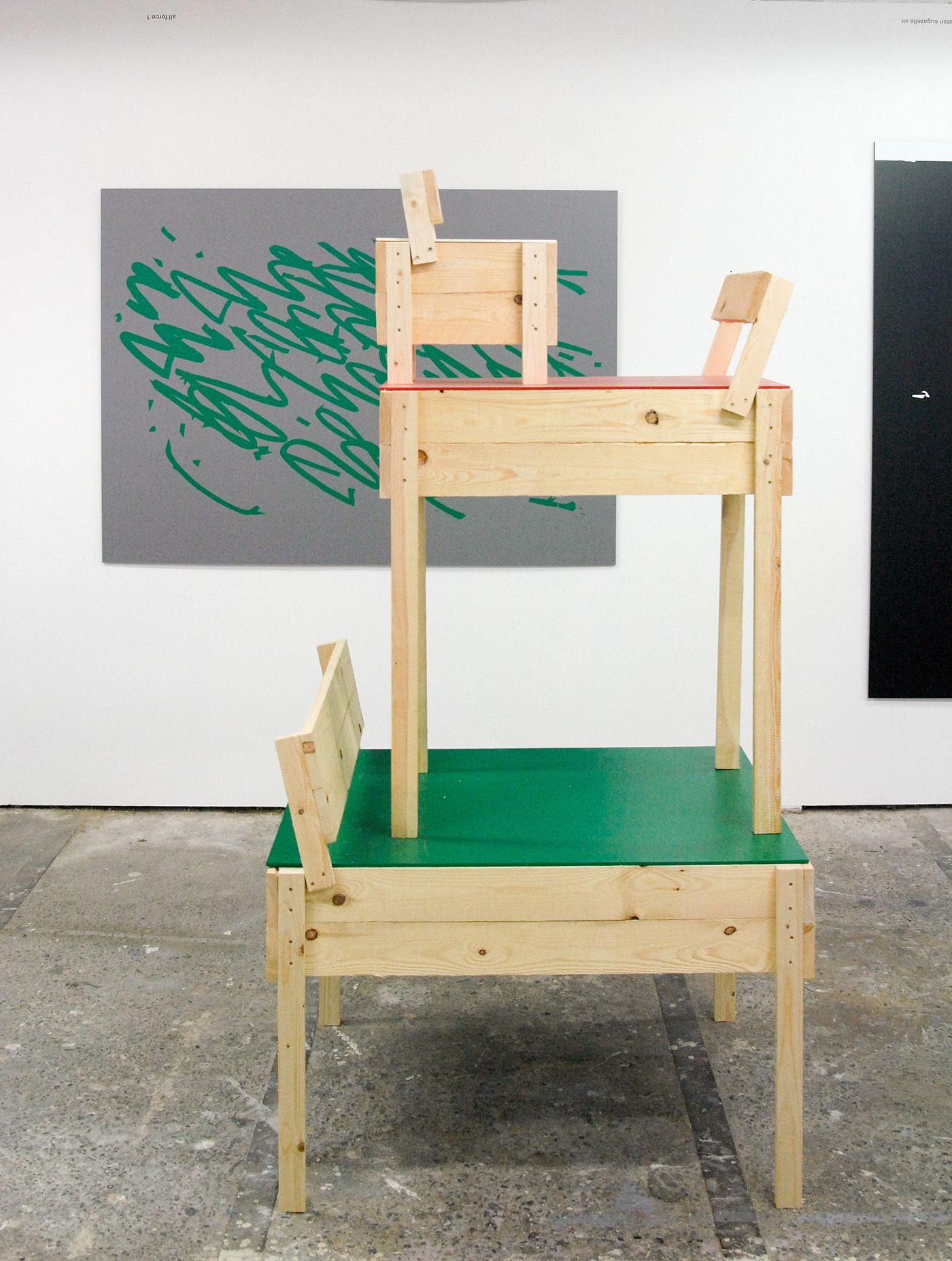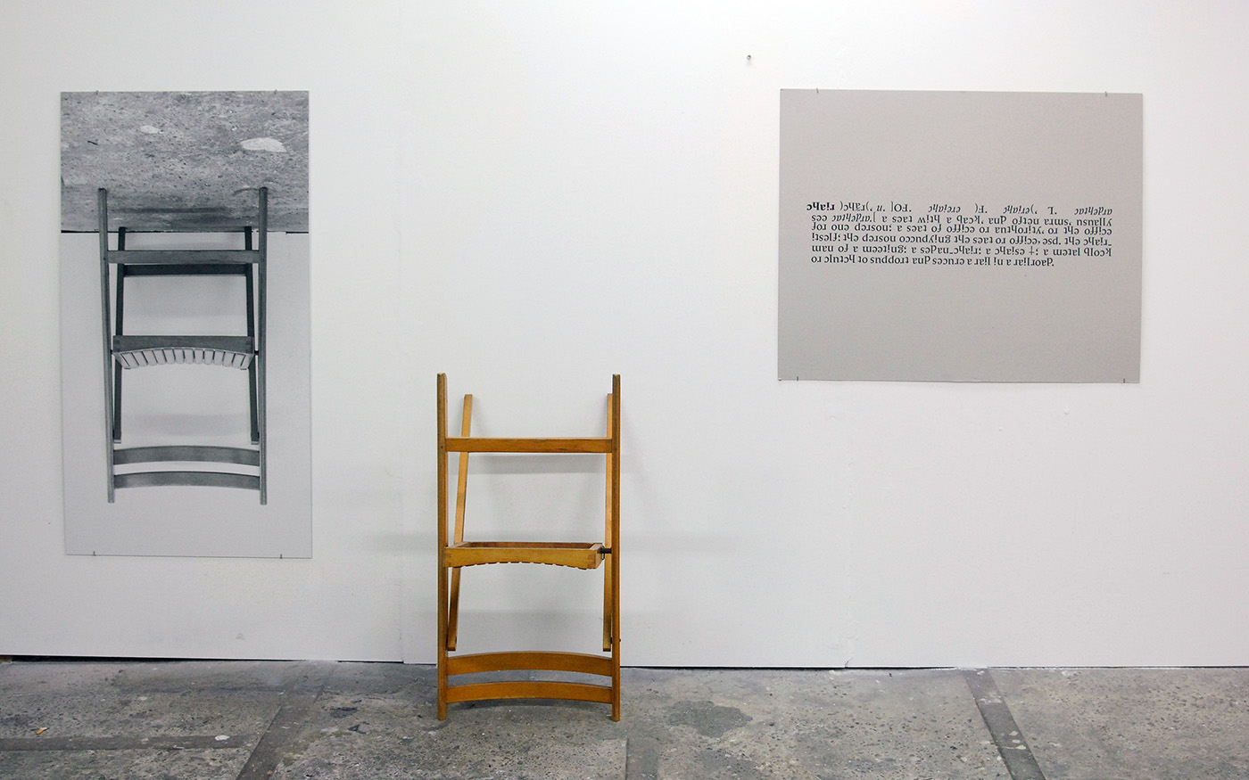 Evelin Brosi & Elvis Bonier – Chair & Stuhl & Stoel – Ruw vurenhout en foamcell (gestructreerd met behulp van de alfabetische linaelen op basis van de plannen van Enzo Mari
