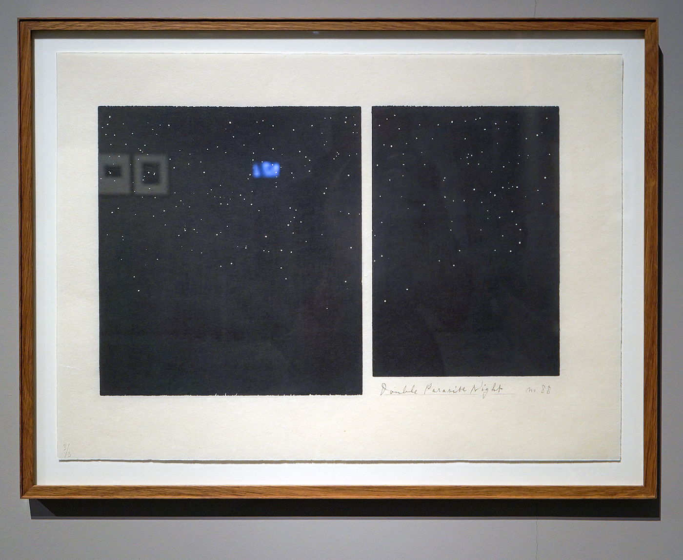 Het werk ‘Double Parasite Night’ toont twee gitzwarte vlakken. Het zijn afdrukken van houten panelen waar houtwormen zich lange tijd aan hebben gelaafd. De gaten die de wormen achter hebben gelaten zijn bij de afdruk verworden tot sterren. De afwezigheid van de worm, de afwezigheid van het hout, is geworden tot kosmologische proporties. De onbruikbare platen hout zijn door een eenvoudige ingreep ineens sterrenhemels geworden. Het lezen van de titel en de materialen zijn dan wel noodzakelijk, anders zie je enkel die twee nachtelijke luchten zonder de conceptuele en poëtische gelaagdheid die zo kenmerkend zijn aan de werken van Mol.
