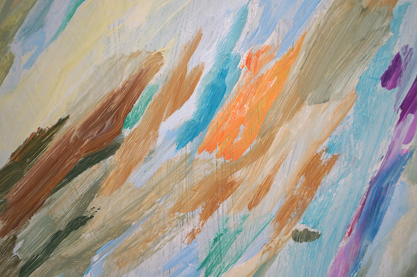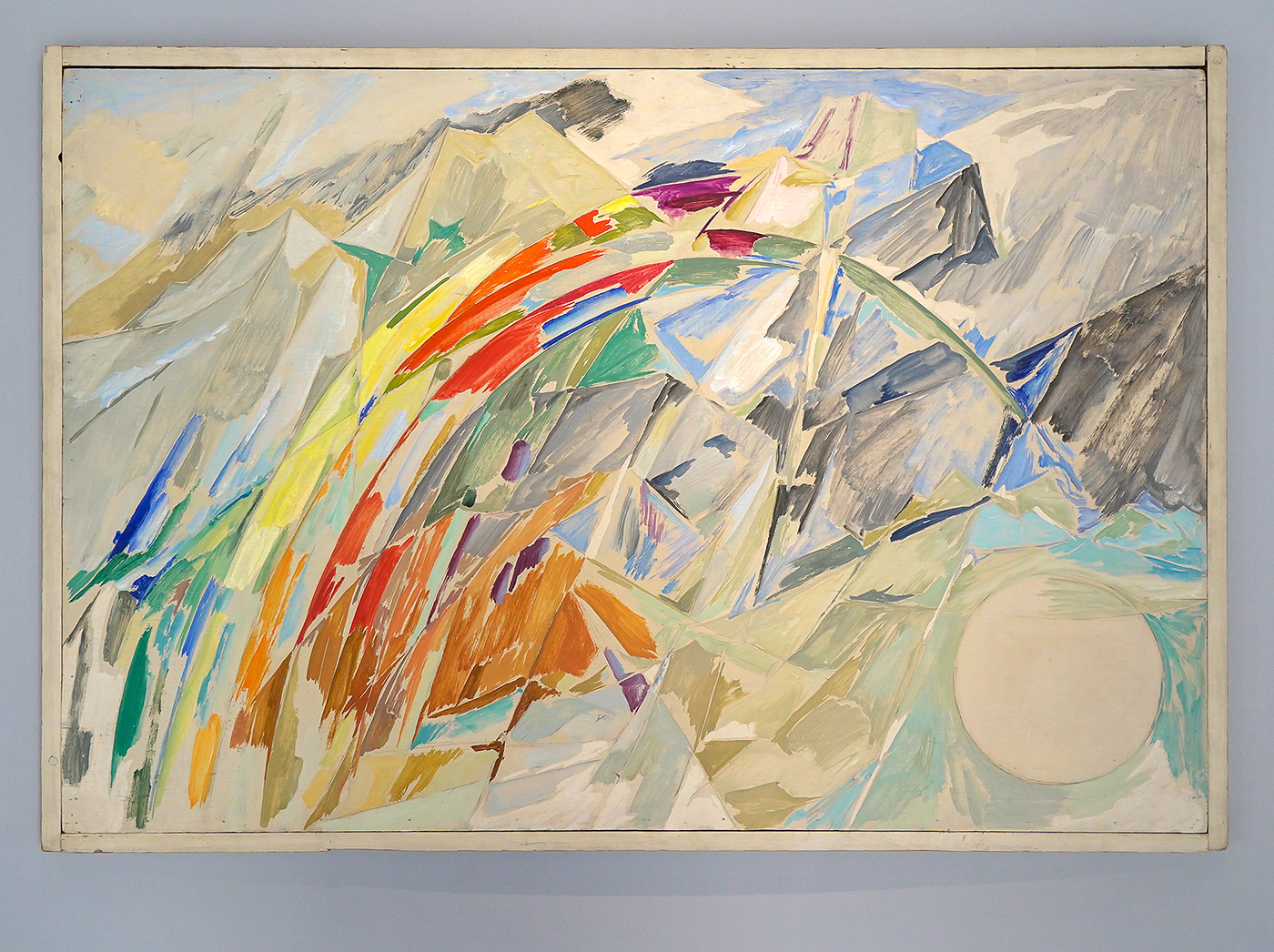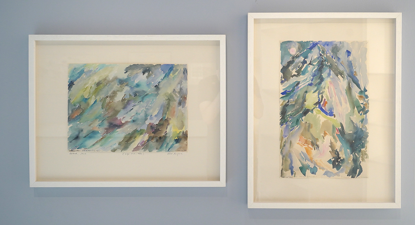 Het werk van Alfelt verbaasd me, want het ziet er helemaal niet Cobra-achtig uit. Bij deze werken geen kinderlijke en ruwe energie met verzadigde kleuren, maar poëtische natuurlandschappen in afgewogen zachte maar heldere kleuren. Op sommige werken is een potloodondertekening op het kalk van de gesso te zien, de daaruit ontstane vlakken worden met expressieve penseelstreken ingevuld waarna de verf mat opdroogt. Hoewel het spontane aspect van Cobra in die penseelstreken terug te vinden is houden de overeenkomsten daar wel mee op. De abstracte vertaalslagen van (berg-) landschappen met maan of regenboog krijgen door de leegte tussen de verfvlekken een haast spirituele dimensie. De leegte in de schilderijen is net zo belangrijk als het verfgeweld dat zich tussen die leegtes afspeelt.