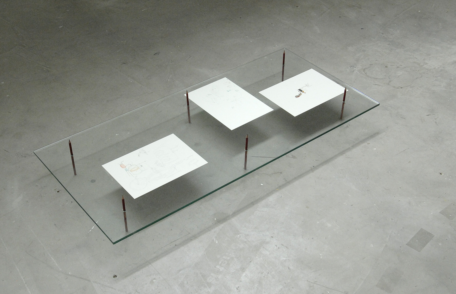 Want ook in het werk zitten veel kwaliteiten die ondanks haar grote formele verschillen (sculpturaal, installatie, video en zelfs tekeningen) toch voorkomen uit een zelfde onderzoek waarin de functie van voorwerpen ondervraagt worden. Hoe werken dingen en hoe vallen die dingen zo te manipuleren dat ze misschien nog wel werken, maar niet zoals je ze verwacht. Zoals bijvoorbeeld de kromme TL , de TL’s die net boven het plateau hangen of de potloden die dienst doen als tafelpoot.