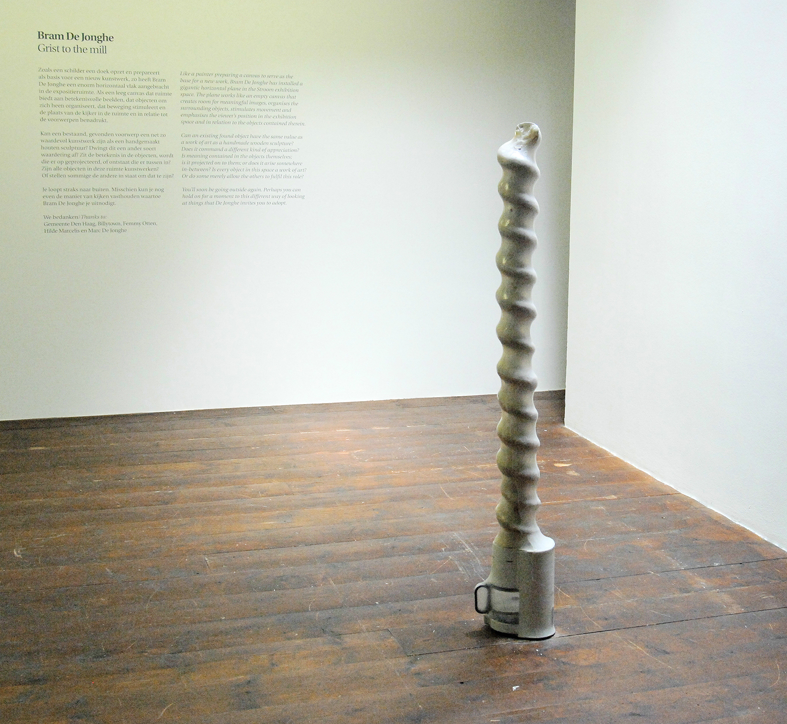 Eigenlijk zit alles in deze tentoonstelling die je bij een goede tentoonstelling wil zien. Allereerst hoop je dat de tentoonstelling in zijn geheel iets opmerkelijks laat zien wat je niet eerder zag. Wat dat is, dat kan van alles zijn. Vervolgens hoop je in een goede tentoonstelling zowel grote gebaren, poëzie, details, associaties en een meerwaarde op de locatie zien. Als het even kan zo af en toe wat brutaliteit naar het institutionele maar niet noodzakelijkerwijze. Maar zelfs daar draait Bram de Jonghe zijn hand niet voor om. Moeiteloos combineert hij al die elementen tot een groot geheel zonder dat de individuele soms zeer poetische uitspraken verdrinken in dat geheel.