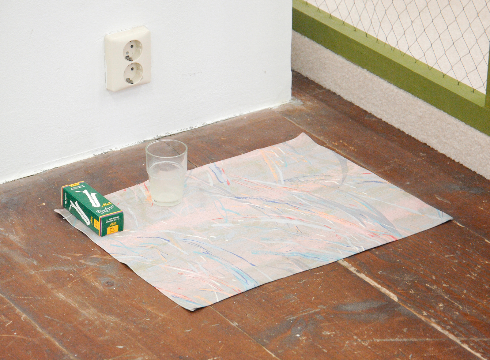 Gareth Moore – A Burning Bag as a Smoke-Grey Lotus (Carpet, Cuttlefish Ink, Baritone Tea, A uman Spoon, Some Rattles, A Suspended Bag, Door Anticipator, 2nd Beach) – Installatie (detail)